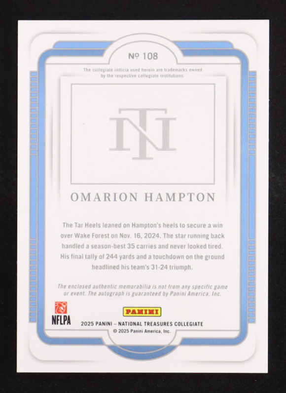 Omarion Hampton 2025 Panini National Treasures Collection Collegiate Century Purple JSY Auto #108 RC #16/25
