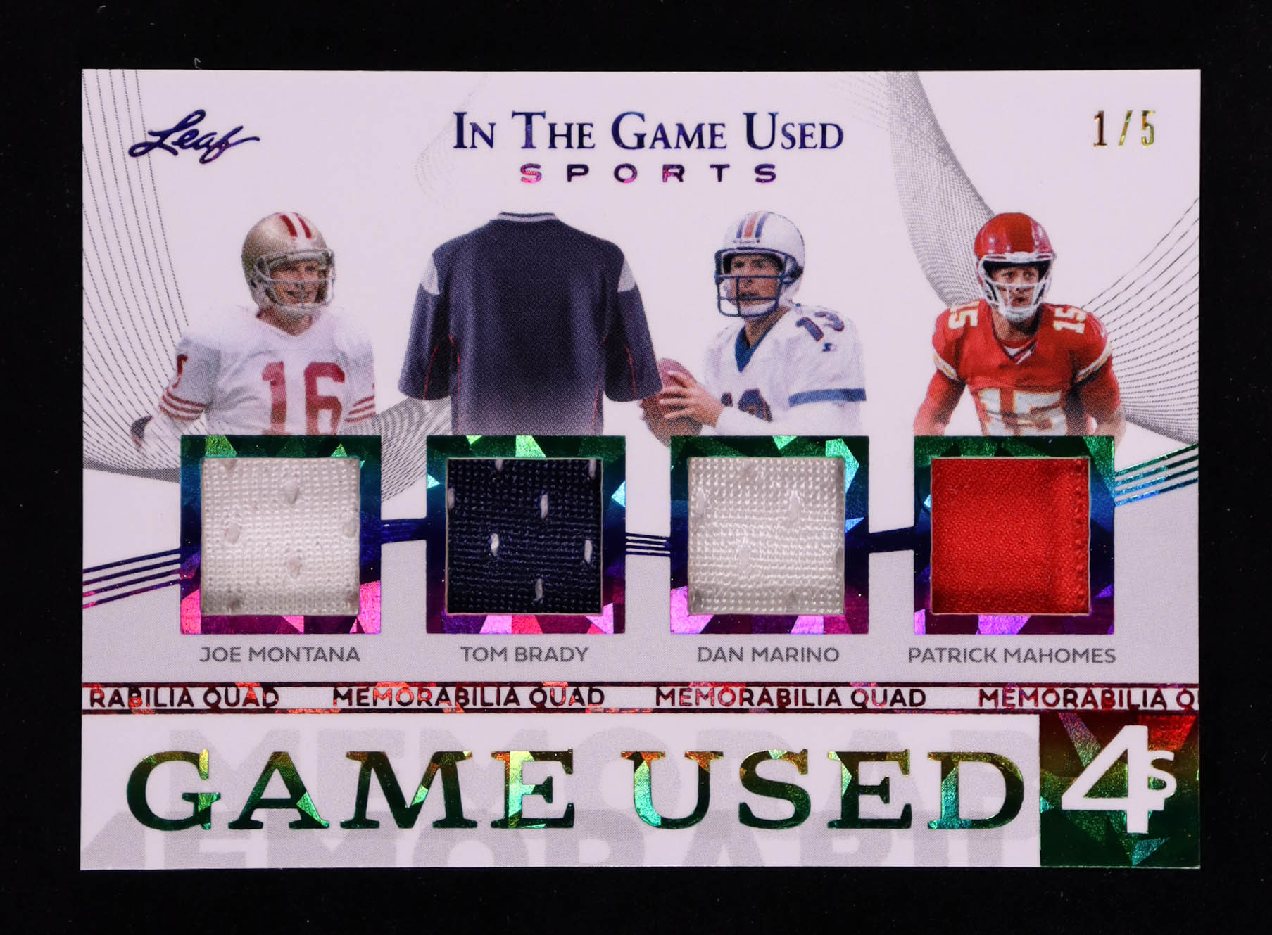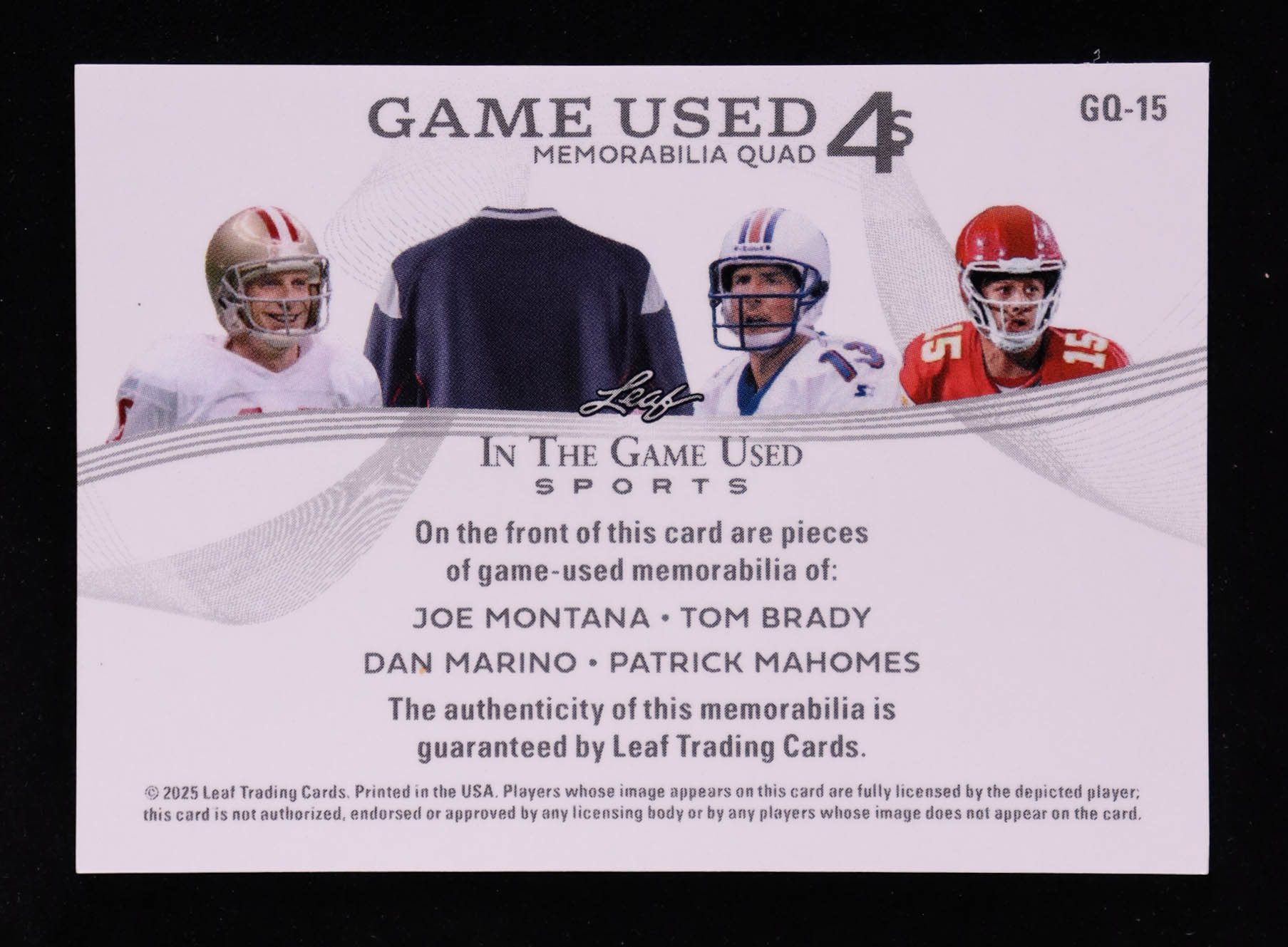Joe Montana / Tom Brady / Dan Marino / Patrick Mahomes 2025 Leaf In The Game Used Game-Used Quad Memorabilia Rainbow Holo #GQ15 #1/5