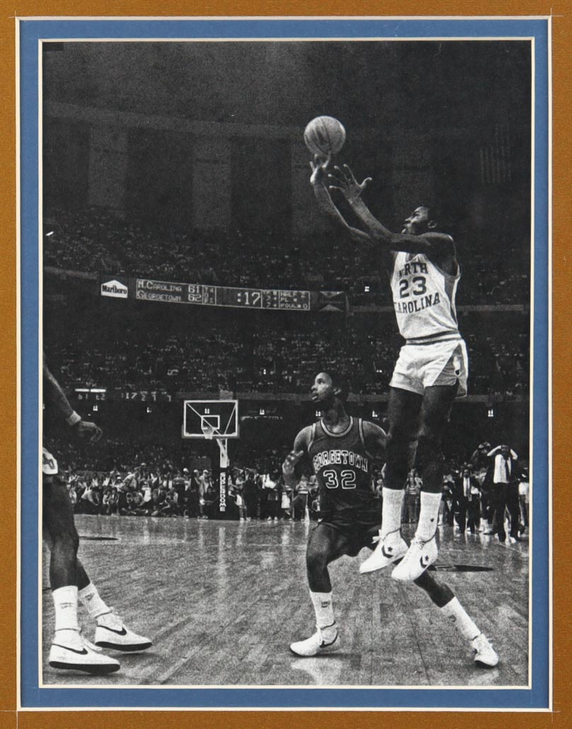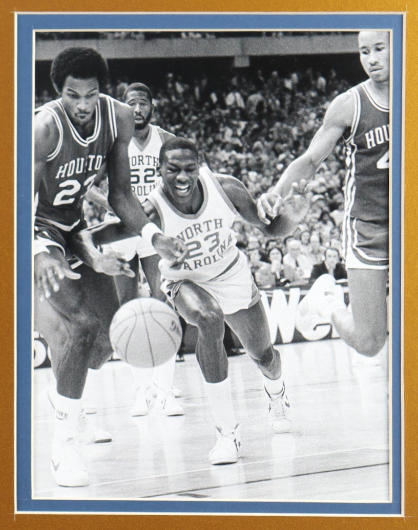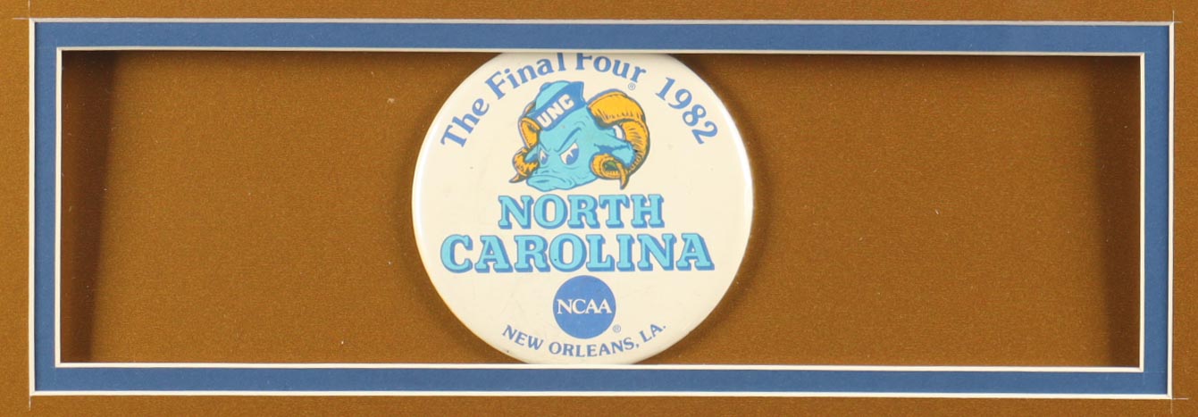 Custom frame measures approximately 32" x 36" in size and features an unsigned Michael Jordan (HOF). The display also includes (2) 8" x 10" Photos, (2) Team Logo patches and a vintage 1982 Tar Heels NCAA Final Four pin. Please note, the display is unsigned.