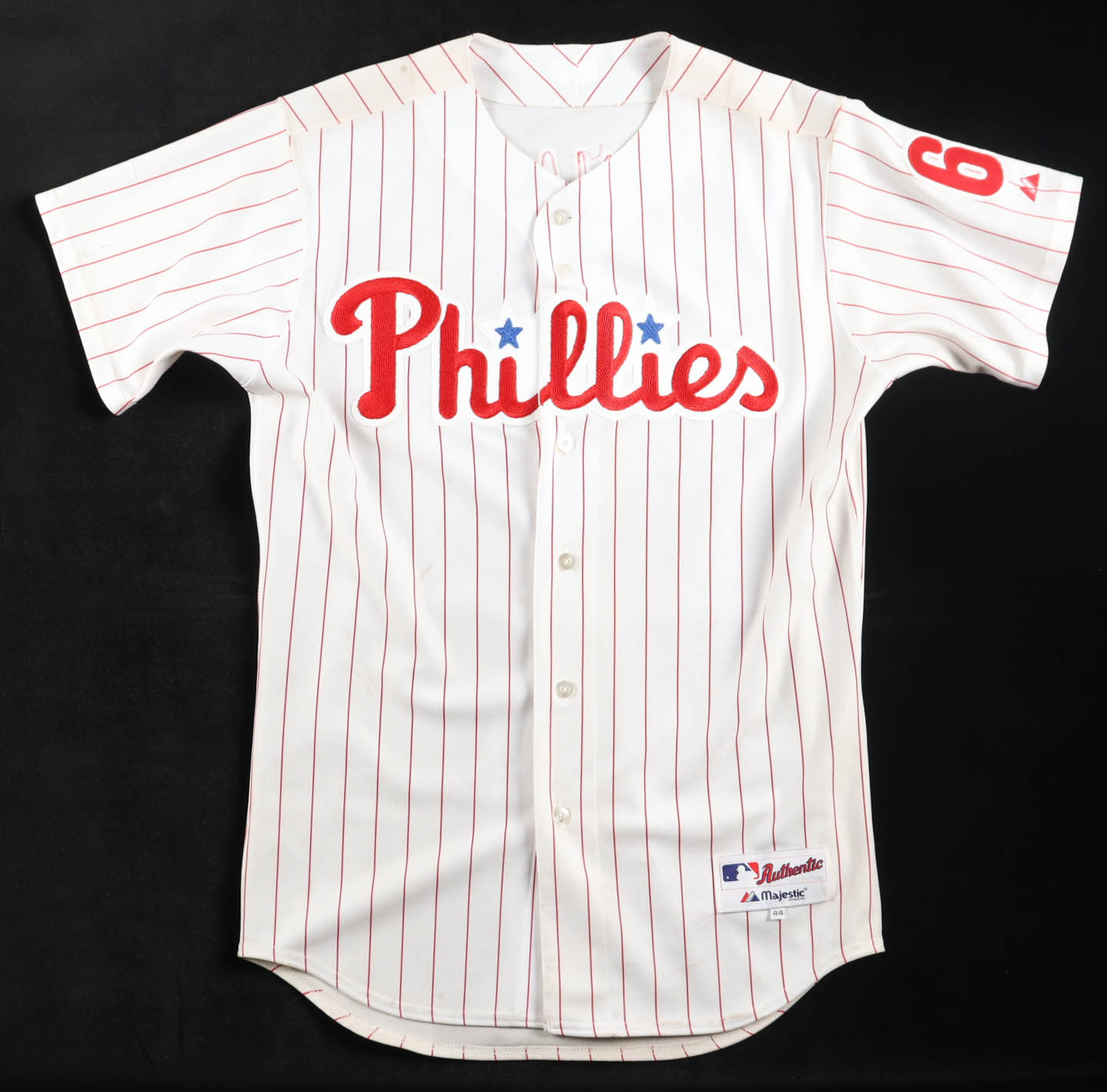 Majestic jersey with everything sewn on, size 44. Hand-signed by Ryan Howard (Philadelphia Phillies). Please note, the bottom of the jersey is stained and discolored.