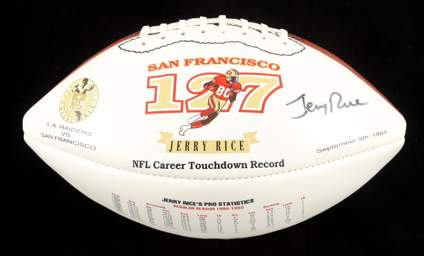 49ers 127 Career Touchdown Record LogoFootball has been hand-signed by Jerry Rice (San Fransisco 49ers, HOF). See photos for more details on condition of the item.