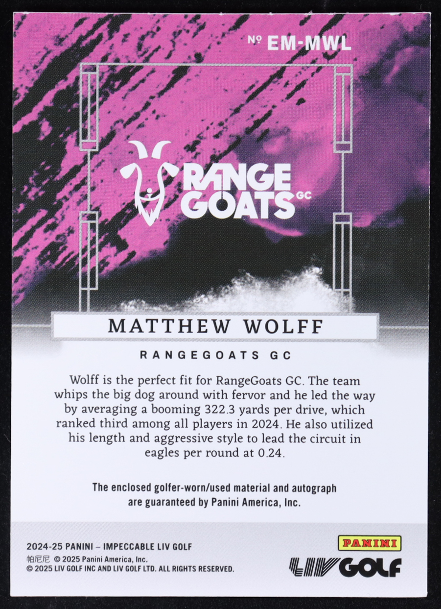 Matthew Wolff 2024-25 Impeccable LIV Elegance Memorabilia Golfer-Worn Autographs #21 #18/19