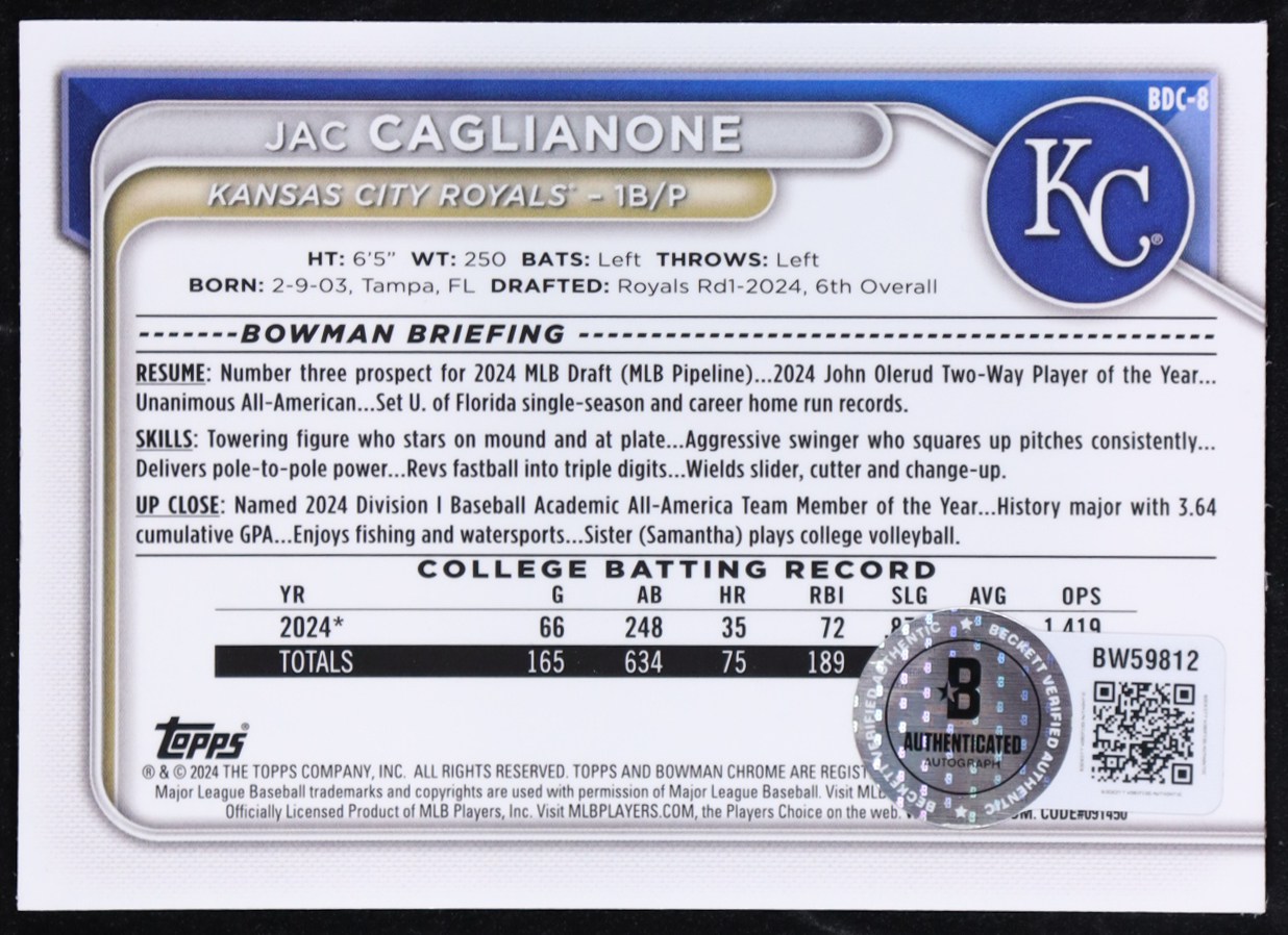 Jac Caglianone 2024 Topps Bowman 1st Draft Chrome Auto #BDC-8 RC