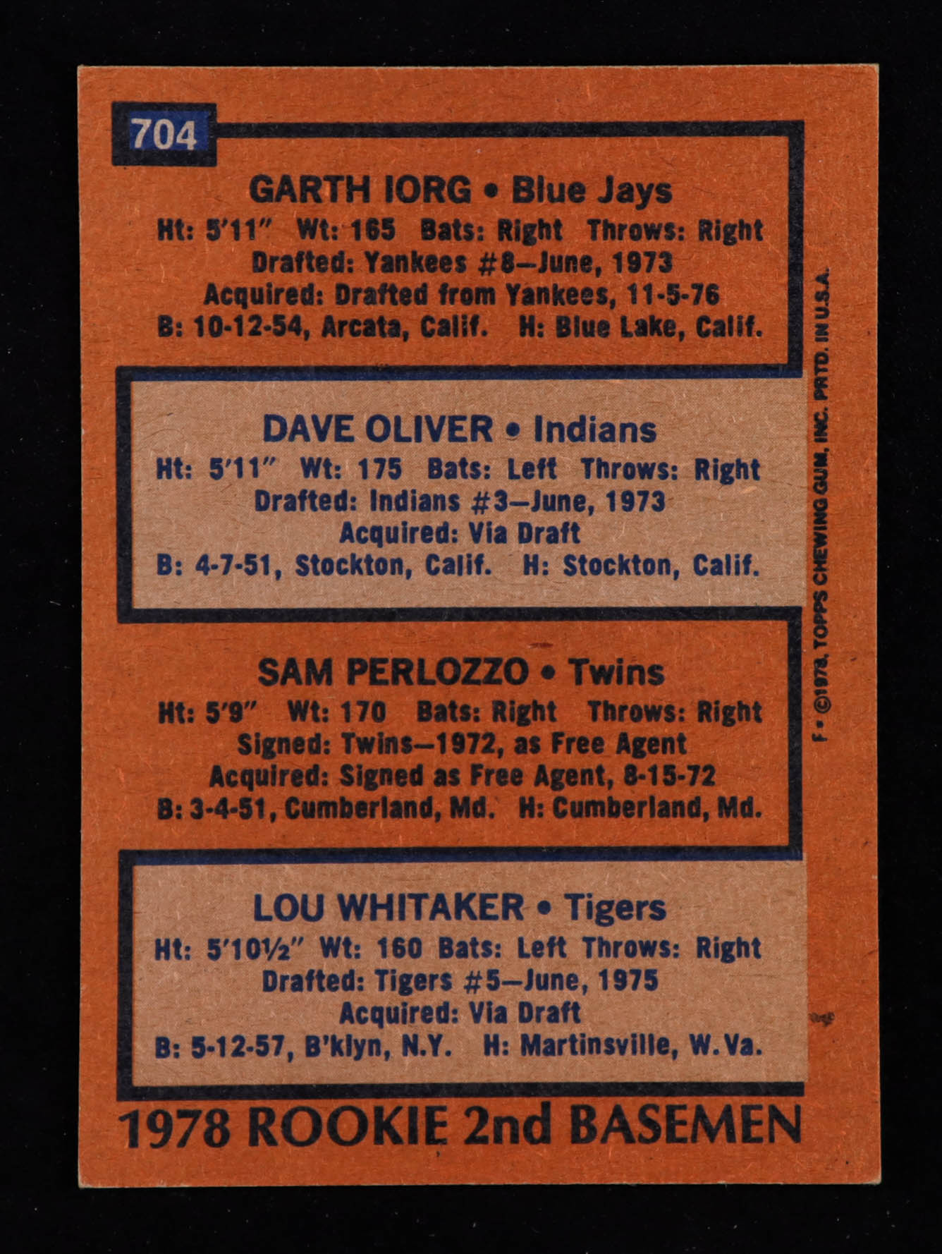 1978 Topps #704 Rookie 2nd Basemen Garth Iorg / Dave Oliver / Sam Perlozzo / Lou Whitaker RC