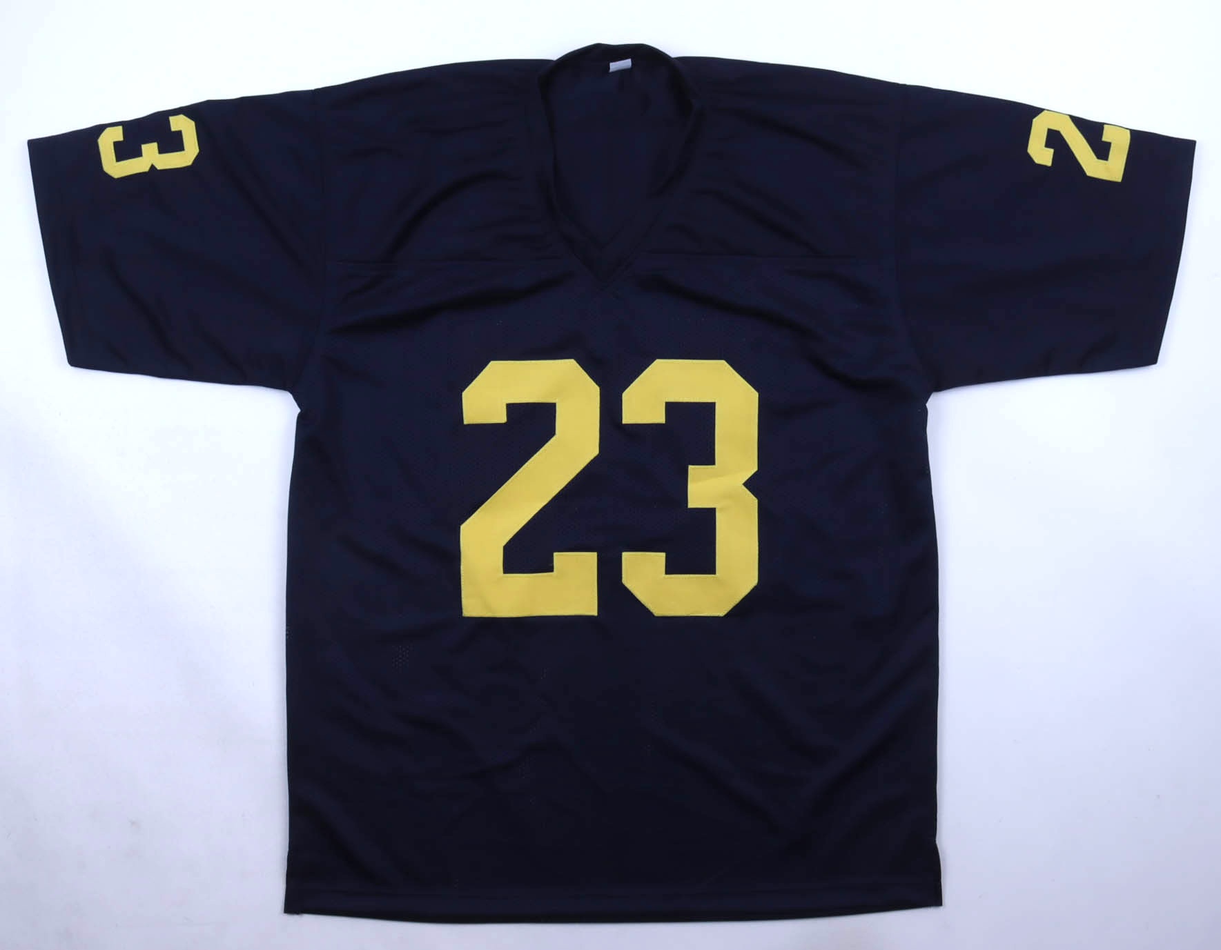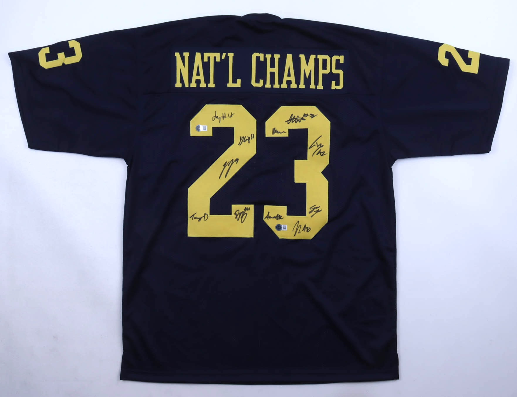 Custom jersey with everything sewn on, size XL. Hand-signed by (11) with Tommy Doman, Ja'Den McBurrows, Greg Crippen, Zeke Berry, J.J. McCarthy, Giovanni El-Hadi, Keshaun Harris, TJ Guy, Joe Taylor, Jimmy Rolder, and Amorion Walker. Please note, glue is visible through the reverse number.