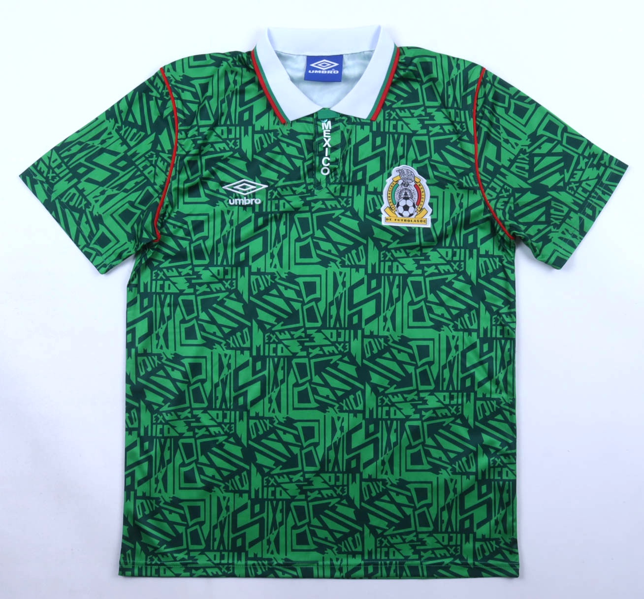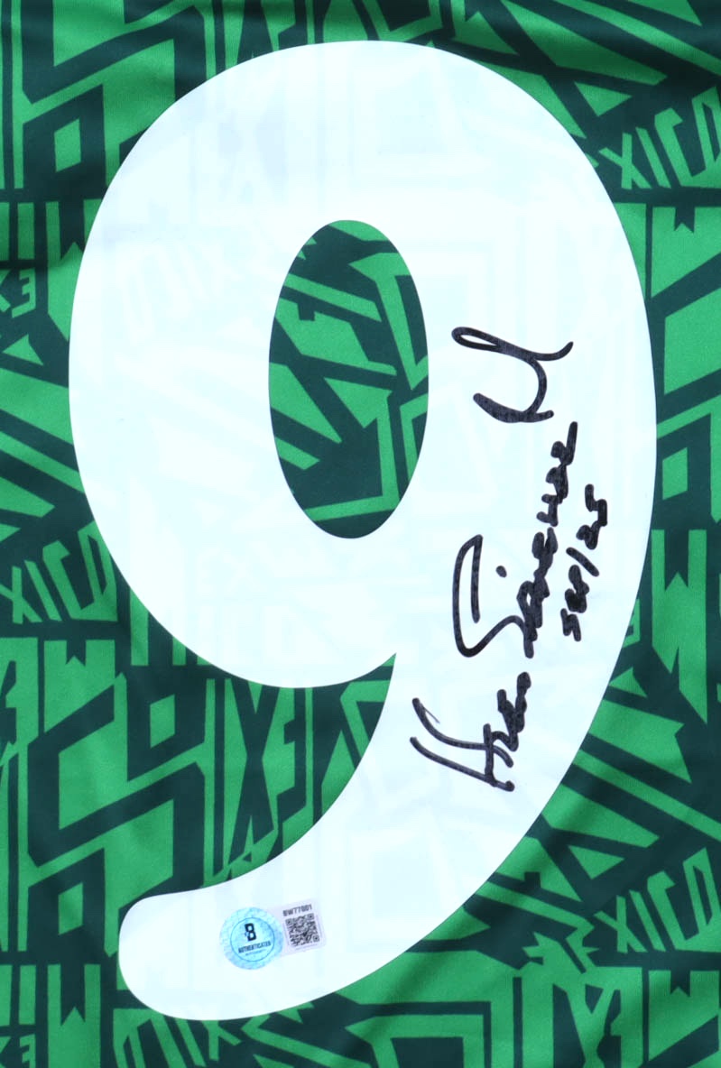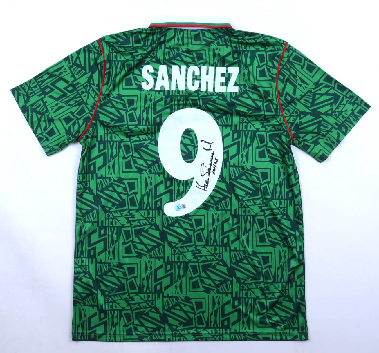 Umbro authentic jersey with everything pressed on, size L. Hand-signed and inscribed by Hugo Sanchez (Mexico National Football Team).