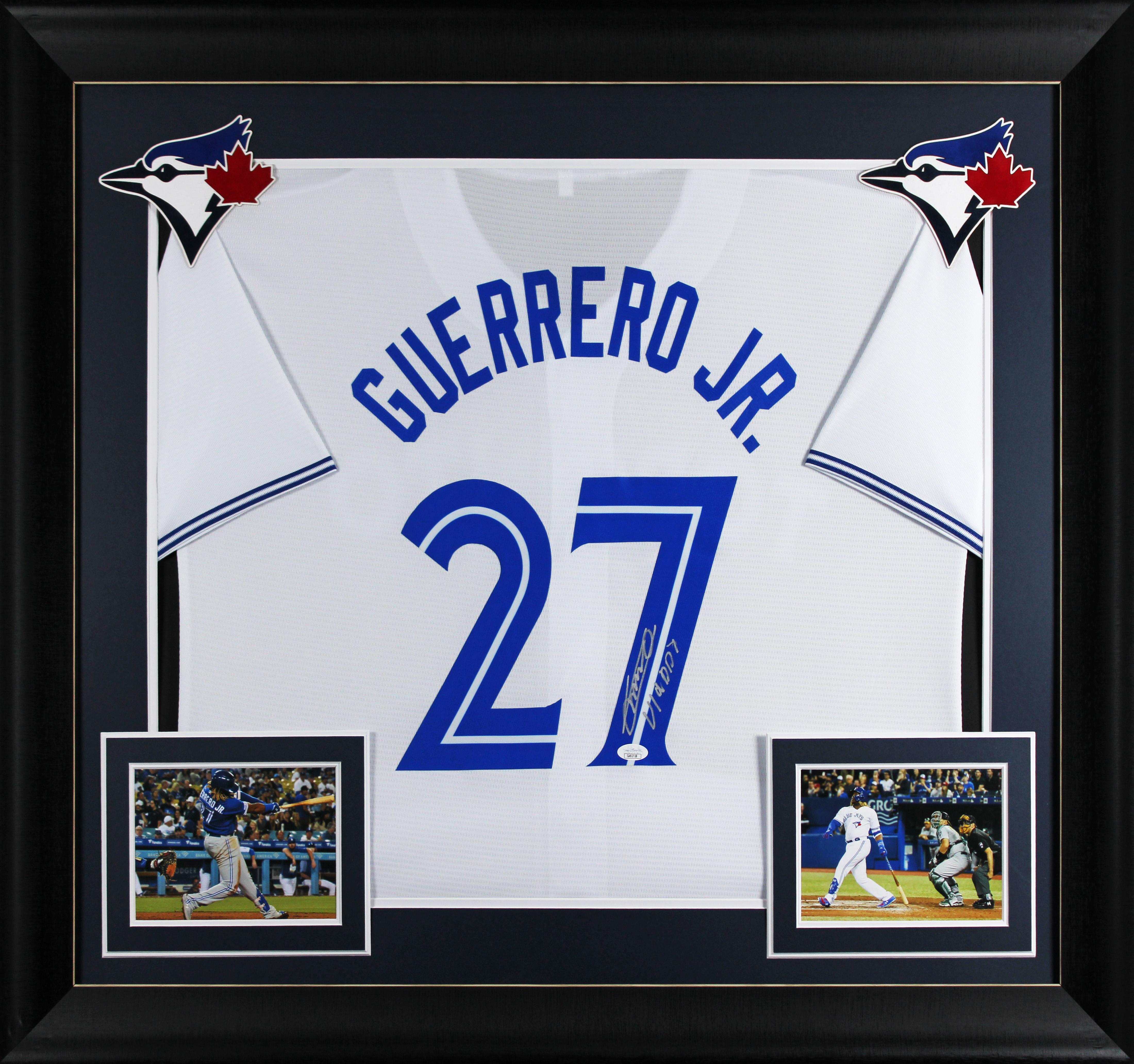 Custom frame measures 32" x 37” in size and features a jersey that has been hand-signed and inscribed by Vladimir Guerrero Jr.