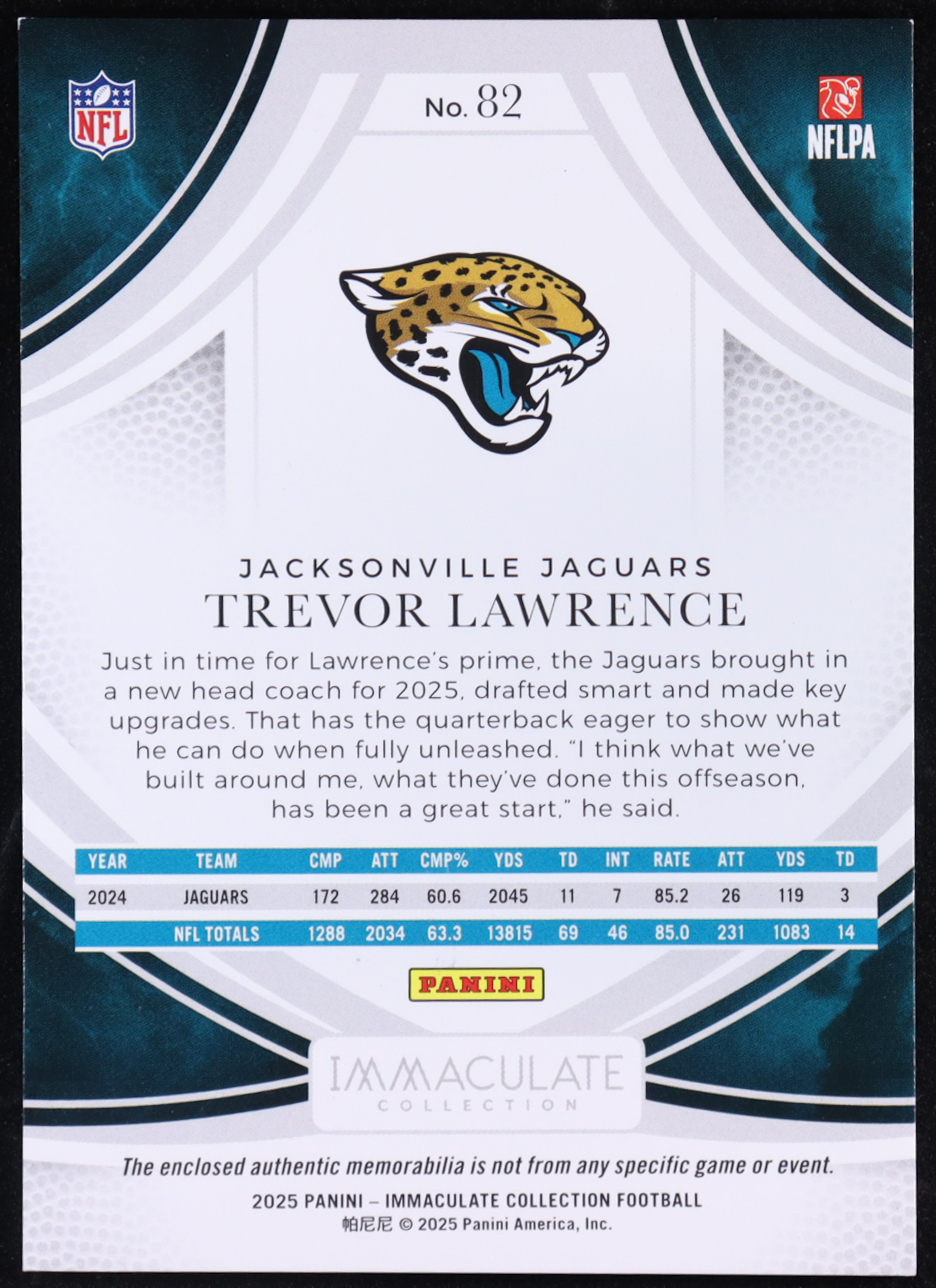 Trevor Lawrence 2025 Panini Immaculate Collection JSY #82 RC #96/99