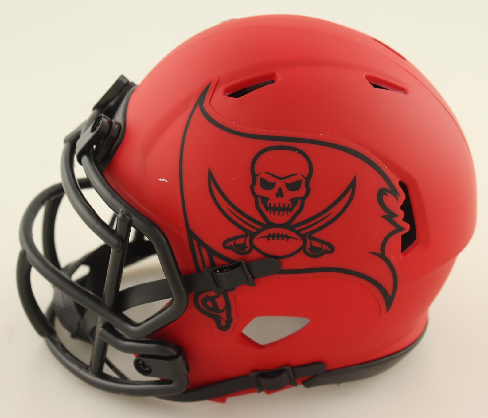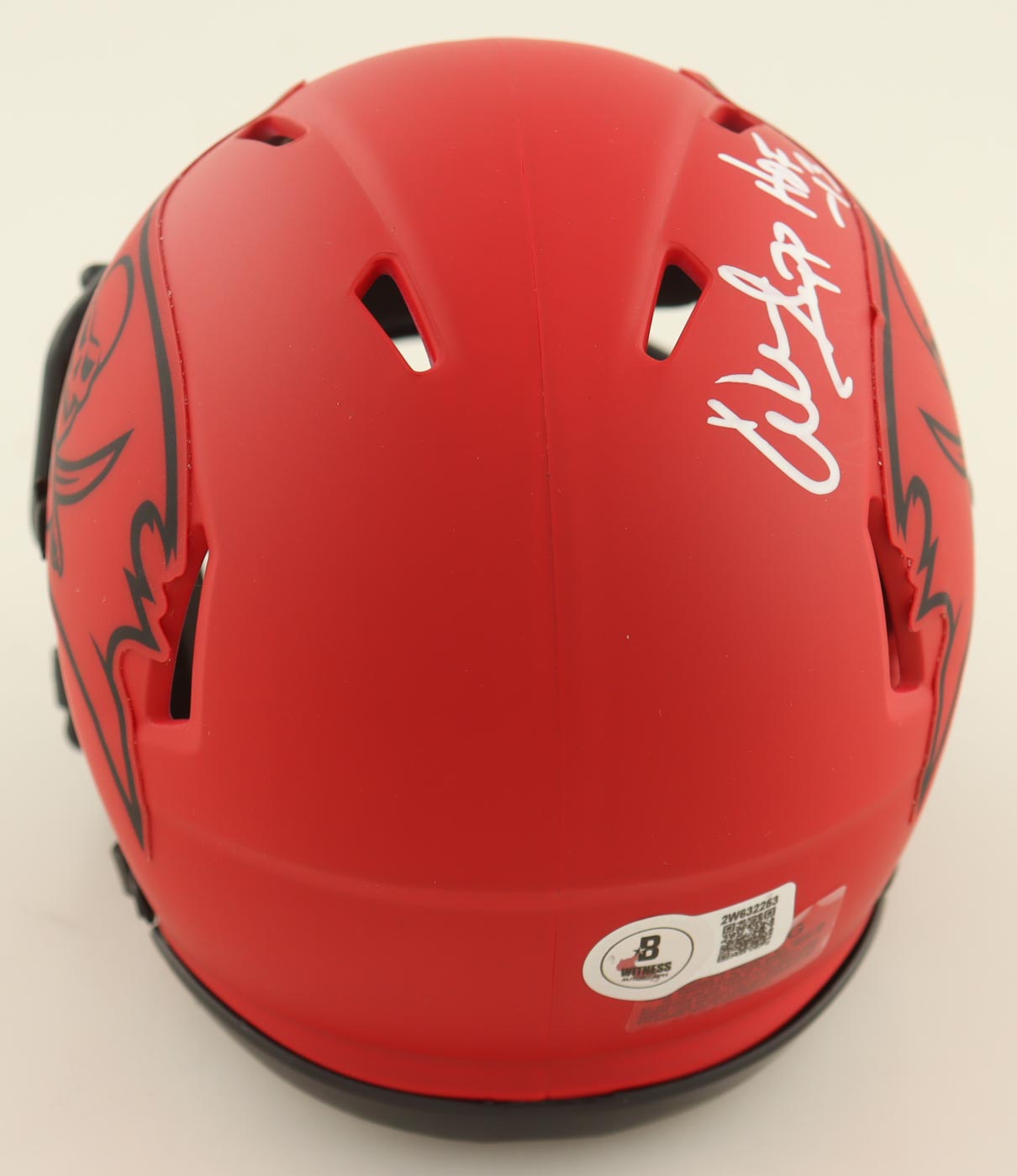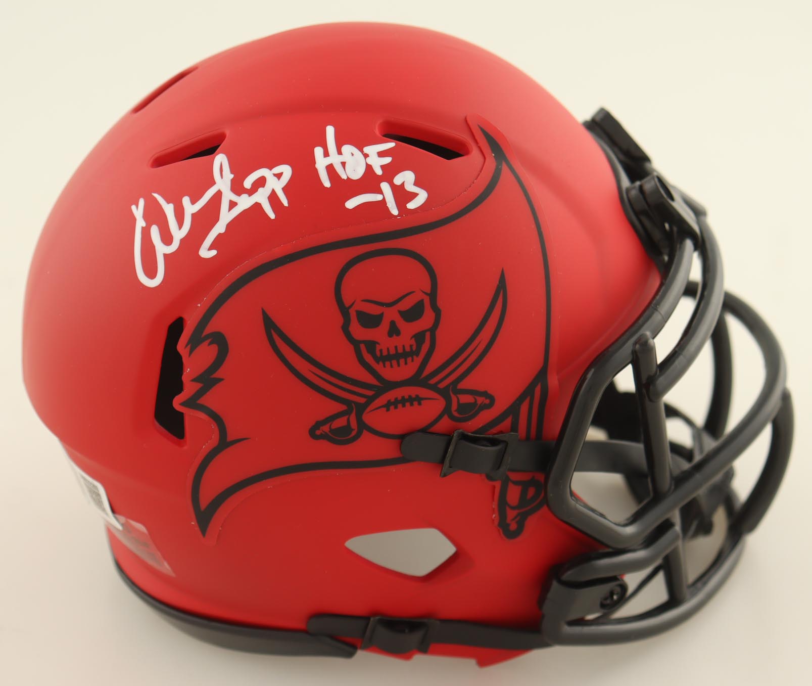 Riddell Tampa Bay Buccaneers Rave Alternate Speed Mini Helmet. Hand-signed and inscribed by Warren Sapp (HOF). Please note, the display case is included.