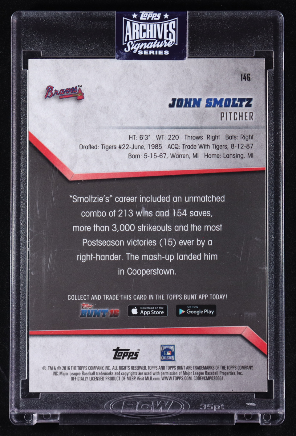 John Smoltz 2020 Topps Archives Signature Series / '16 Topps Bunt #146 #1/1