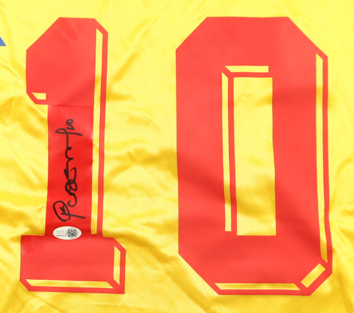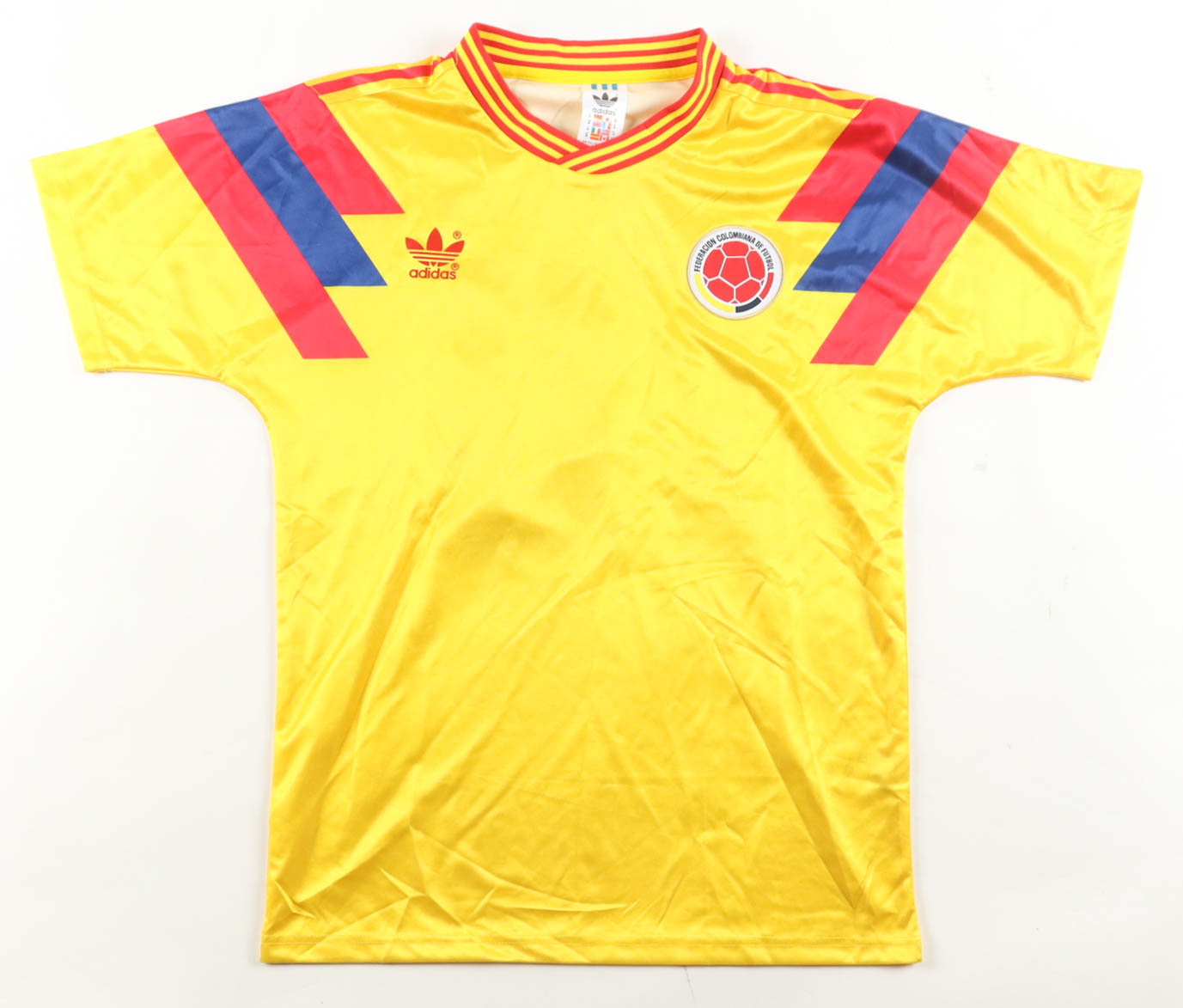 Adidas authentic jersey with everything pressed and sewn on, size M. Hand-signed by Carlos Valderrama (Columbian National Team).