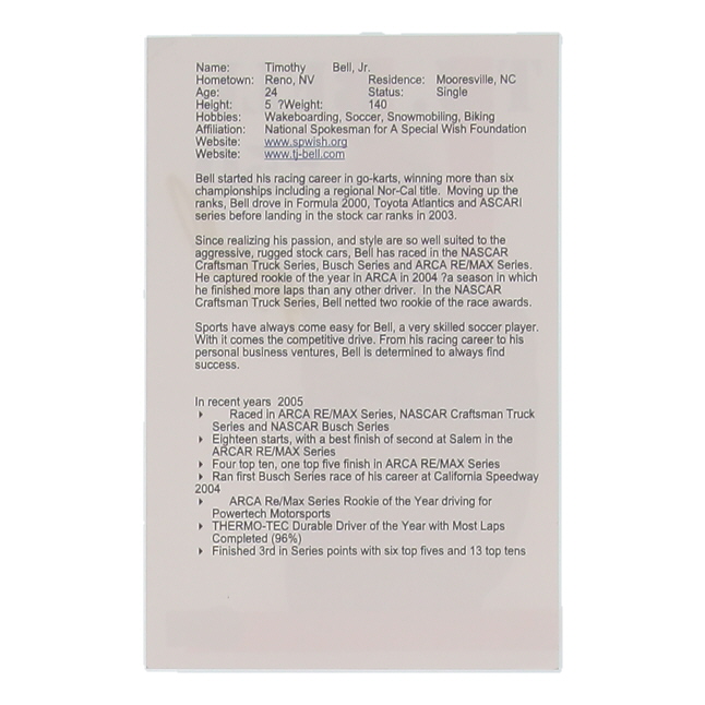 T. J. Bell Signed NASCAR 5.5x8.5 Hero Card (Beckett)