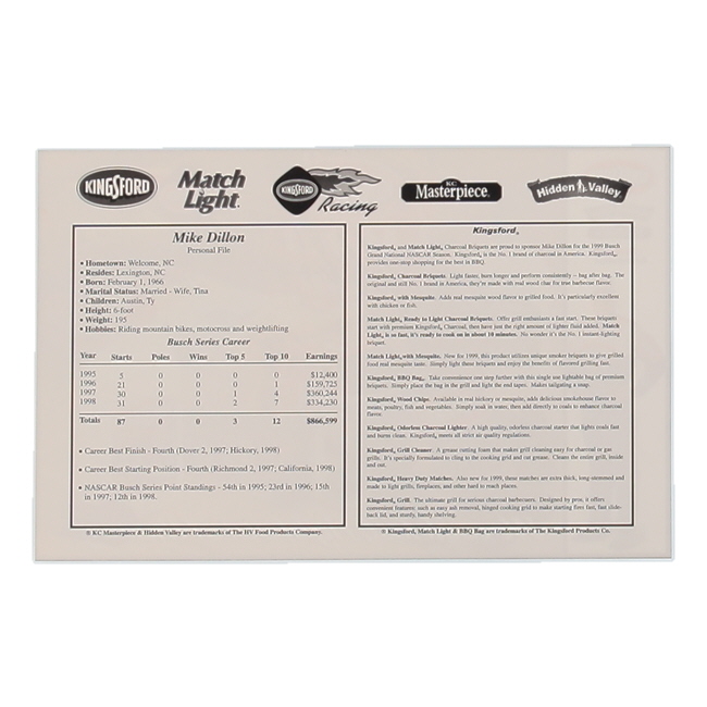 Mike Dillon Signed NASCAR 6x9 Hero Card (Beckett)
