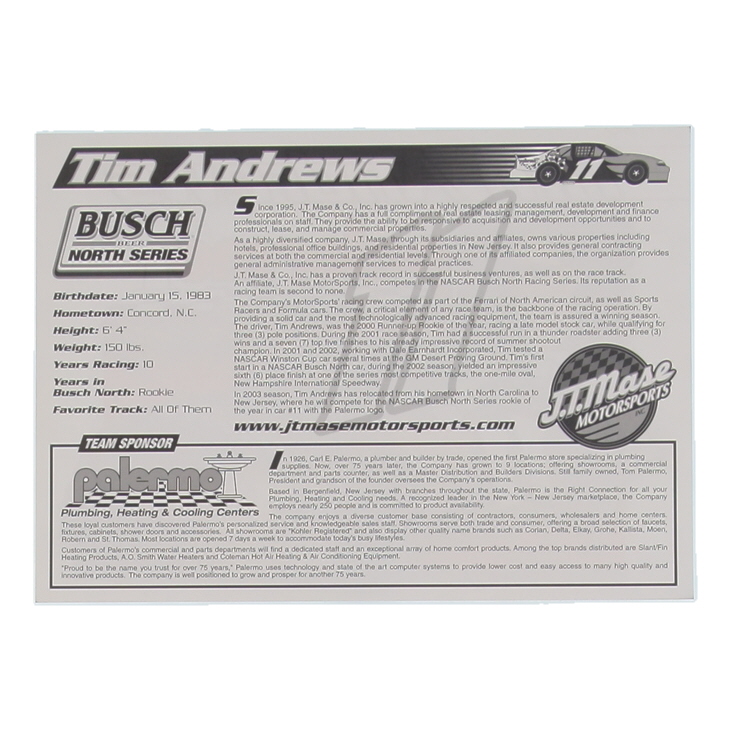 Tim Andrews Signed NASCAR 6x9 Hero Card (Beckett)