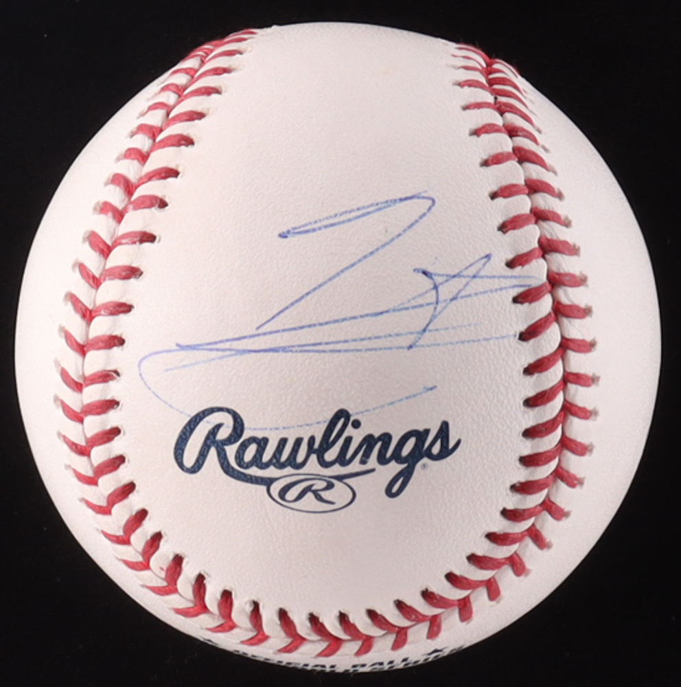 Rawlings Official 2025 World Series logo baseball has been hand-signed by Hyeseong Kim (Los Angeles Dodgers).
