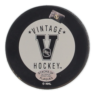 Boston Bruins Logo Hockey Puck. Hand-signed by John "Pie" McKenzie (D. 2018). Please note, the signature has been smudged and there are stains throughout the puck.