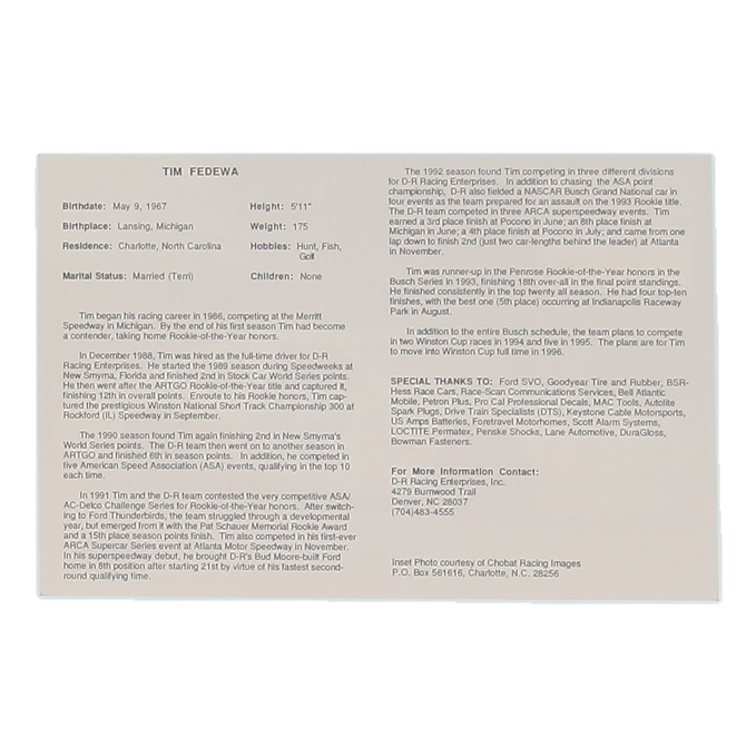 Tim Fedewa Signed NASCAR 6x9 Hero Card (Beckett)