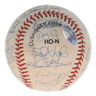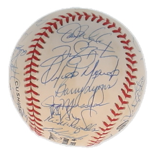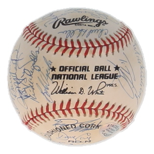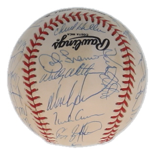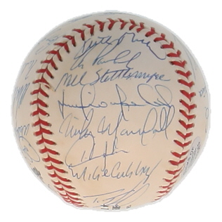 Rawlings Official National League Baseball. Hand-signed by Doc Gooden, Darryl Strawberry, Bud Harrelson, David Cone, Howard Johnson, Mel Stottlemyre, Gregg Jefferies, Frank Viola, Kevin McReynolds, John Franco, Dave Magadan, Daryl Boston, Mackey Sasser, Bob Ojeda, Alejandro Pena, Wally Whitehurst, Tim Teufel, Kevin Elster, Barry Lyons, Orlando Mercado, Mike Marshall, Julio Machado, Jeff Musselman, Chuck Hiller, and (7) others.