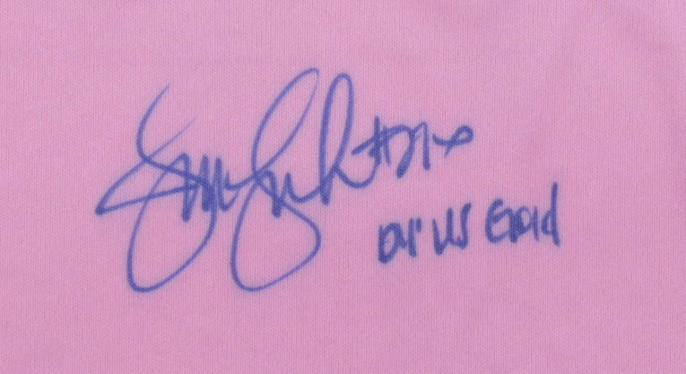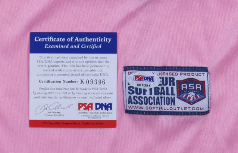 Custom jersey with everything sewn on, size M. Hand-signed ad inscribed by Jennie Finch.