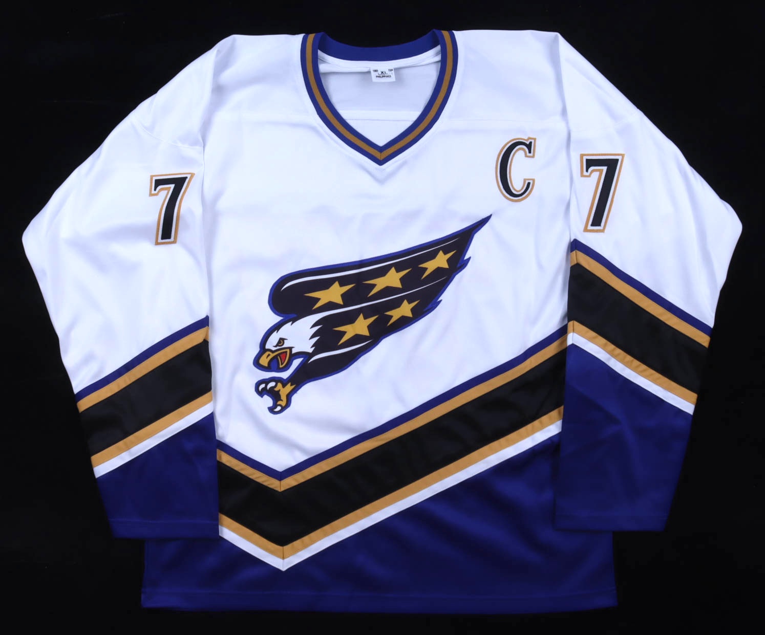 Custom jersey with everything sewn on, size XL. Hand-signed and inscribed by Adam Oates (HOF).
