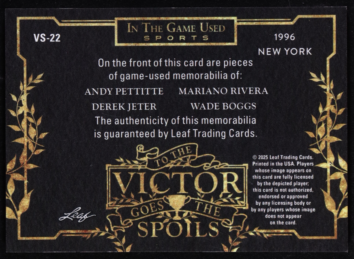 2025 Leaf in the Game Used To the Victor Goes the Spoils Game-Used Quad Memorabilia Blue Holo #VS-22 #13/35 Andy Pettitte / Derek Jeter / Mariano Rivera / Wade Boggs