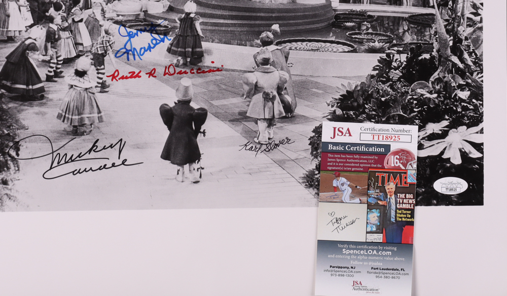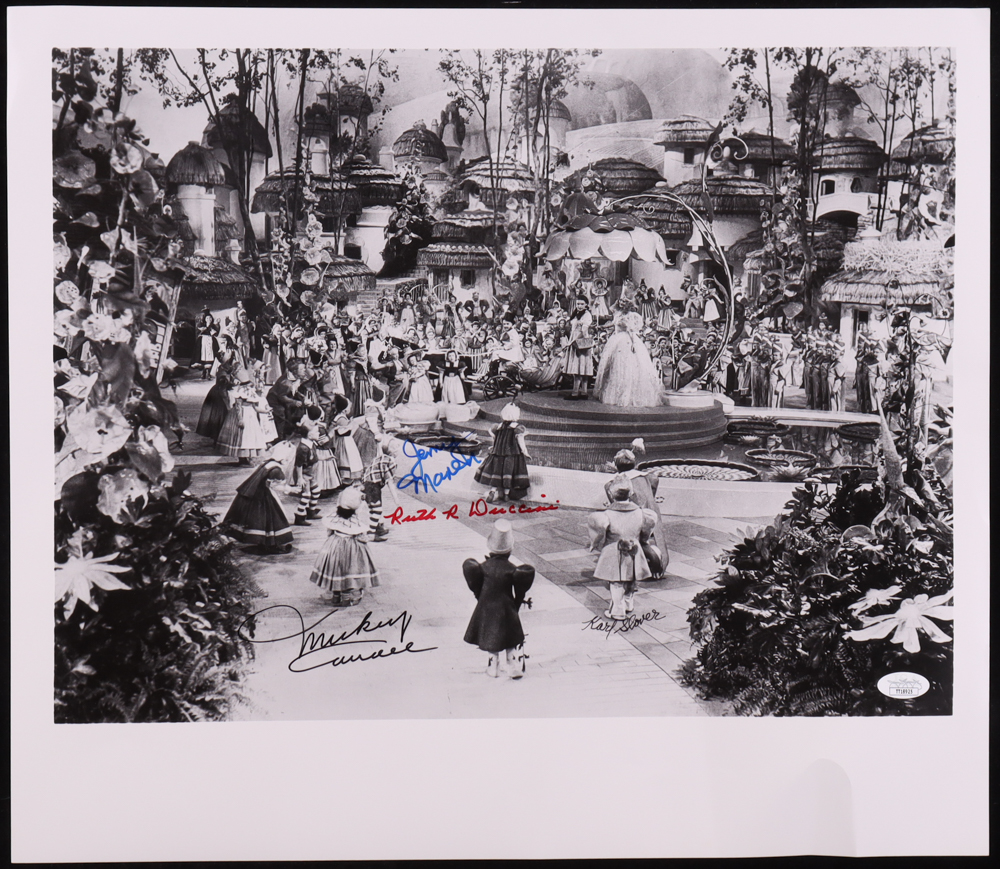 Photo measures approximately 16" x 18.5" in size and has been hand-signed by (4) with Karl Slover (D. 2011), Mickey Carroll (D. 2009), Jerry Maren (D. 2018) and Ruth Duccini (D. 2014).