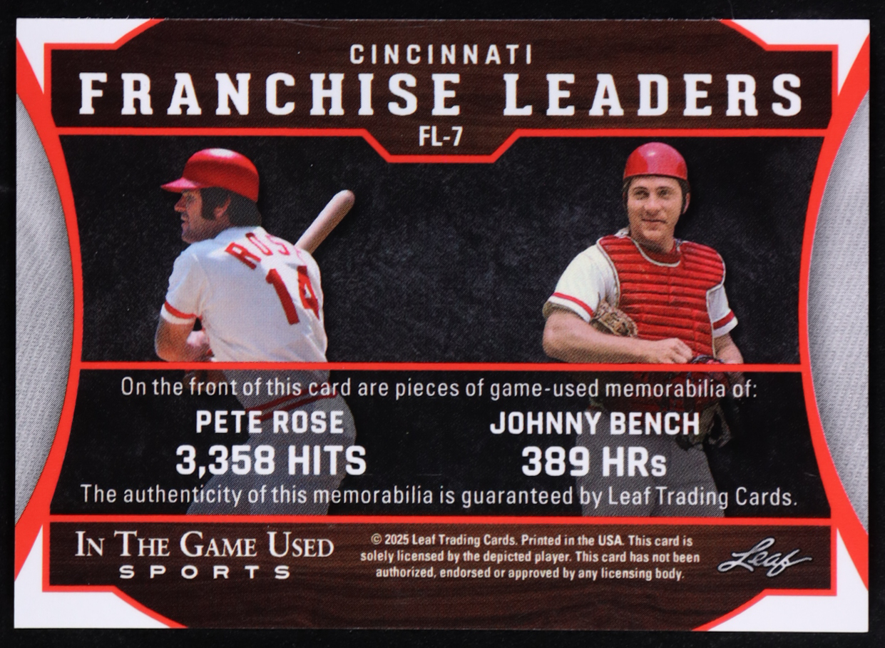 Pete Rose / Johnny Bench 2025 Leaf in the Game Used Franchise Leaders Game-Used Dual Memorabilia Blue Holo #FL-7 #6/8