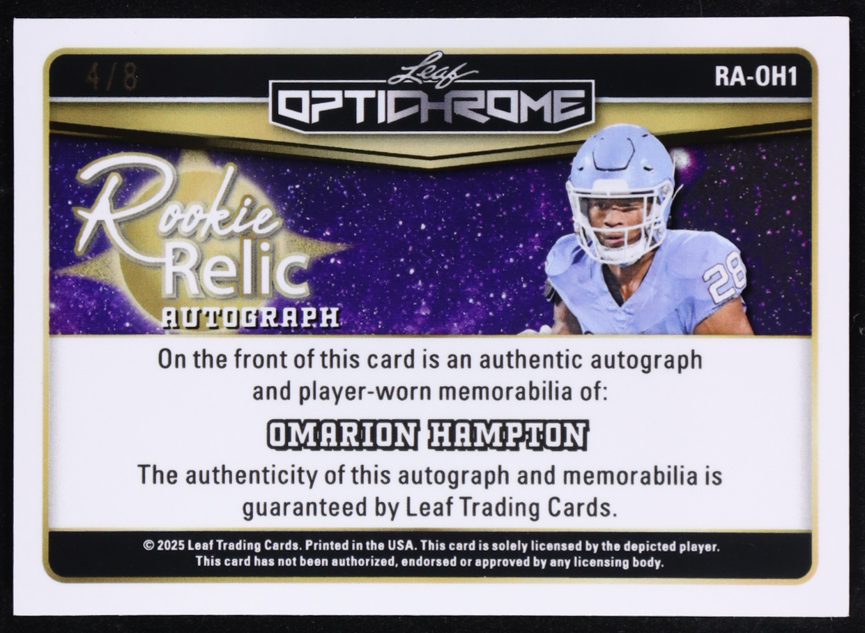 Omarion Hampton 2025 Leaf Optichrome Rookie Relic Autograph Prismatic Magenta #RA-OH1 #4/8 RC