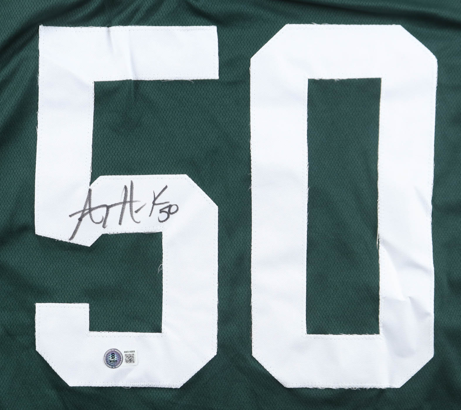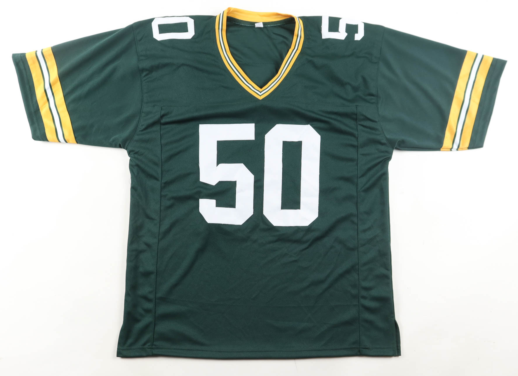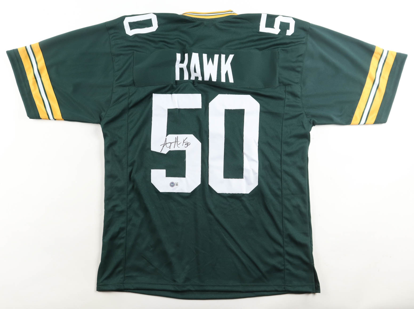 Custom jersey with everything sewn on, size XL. Hand-signed by A. J. Hawk (Green Bay Packers).