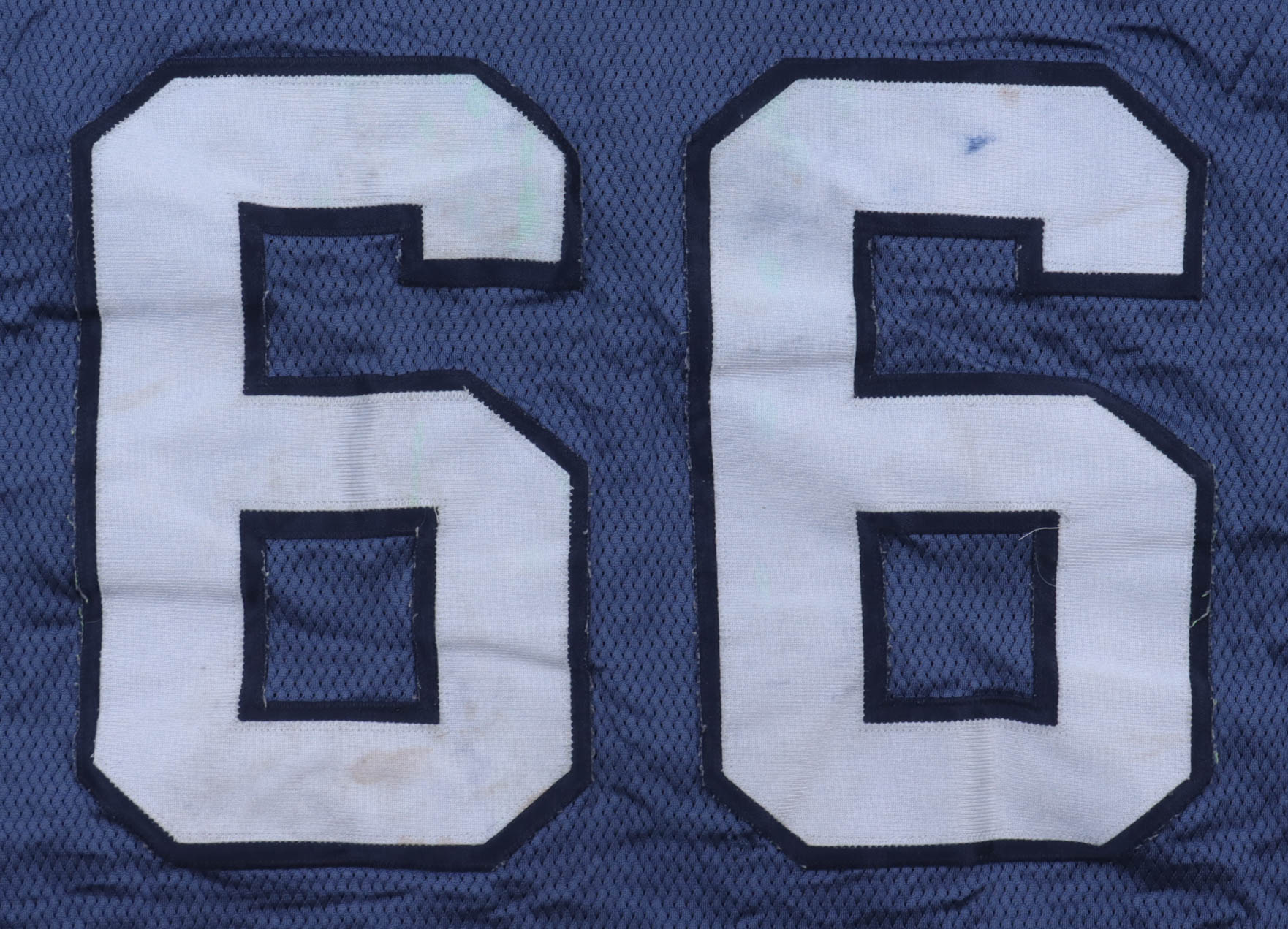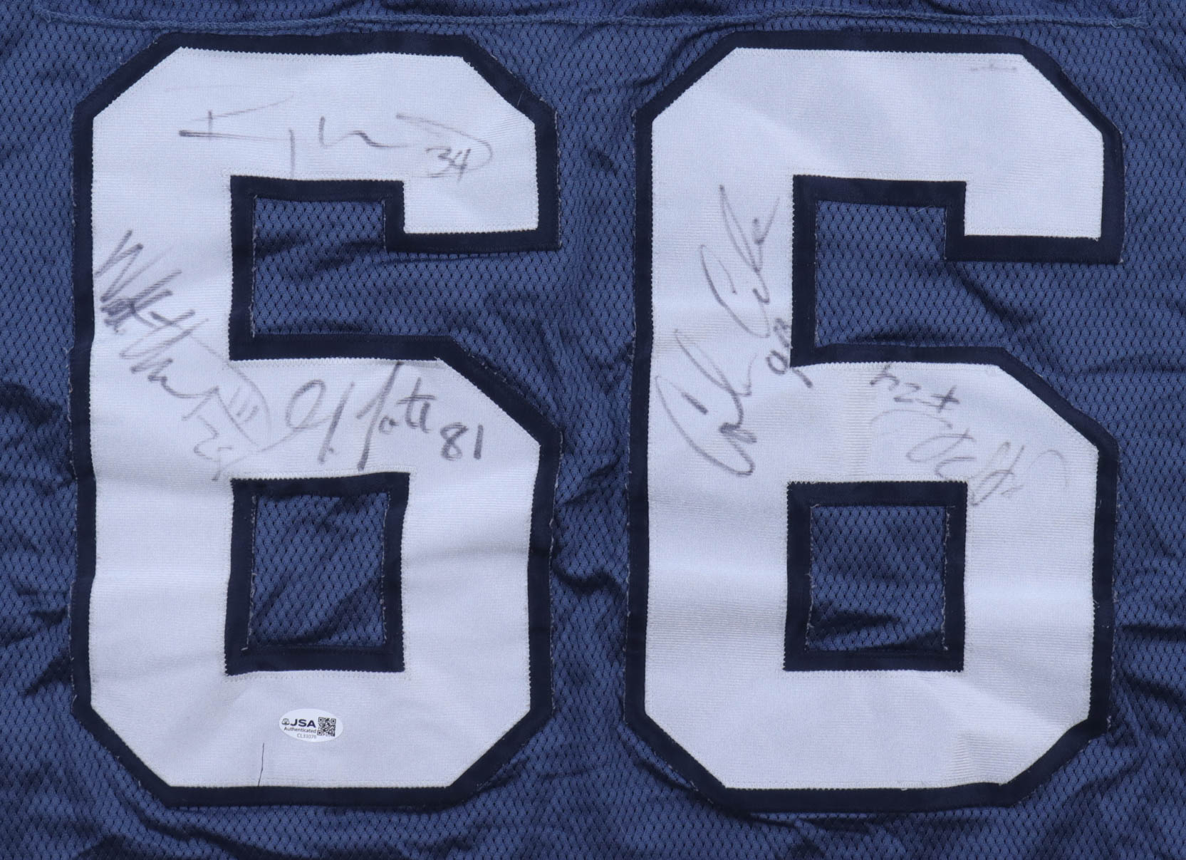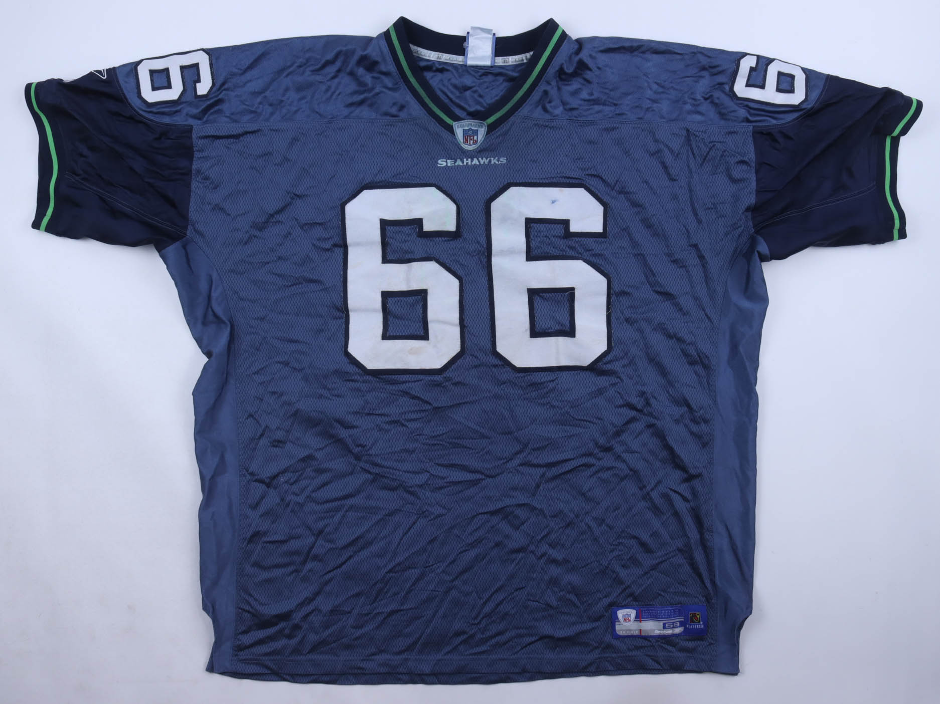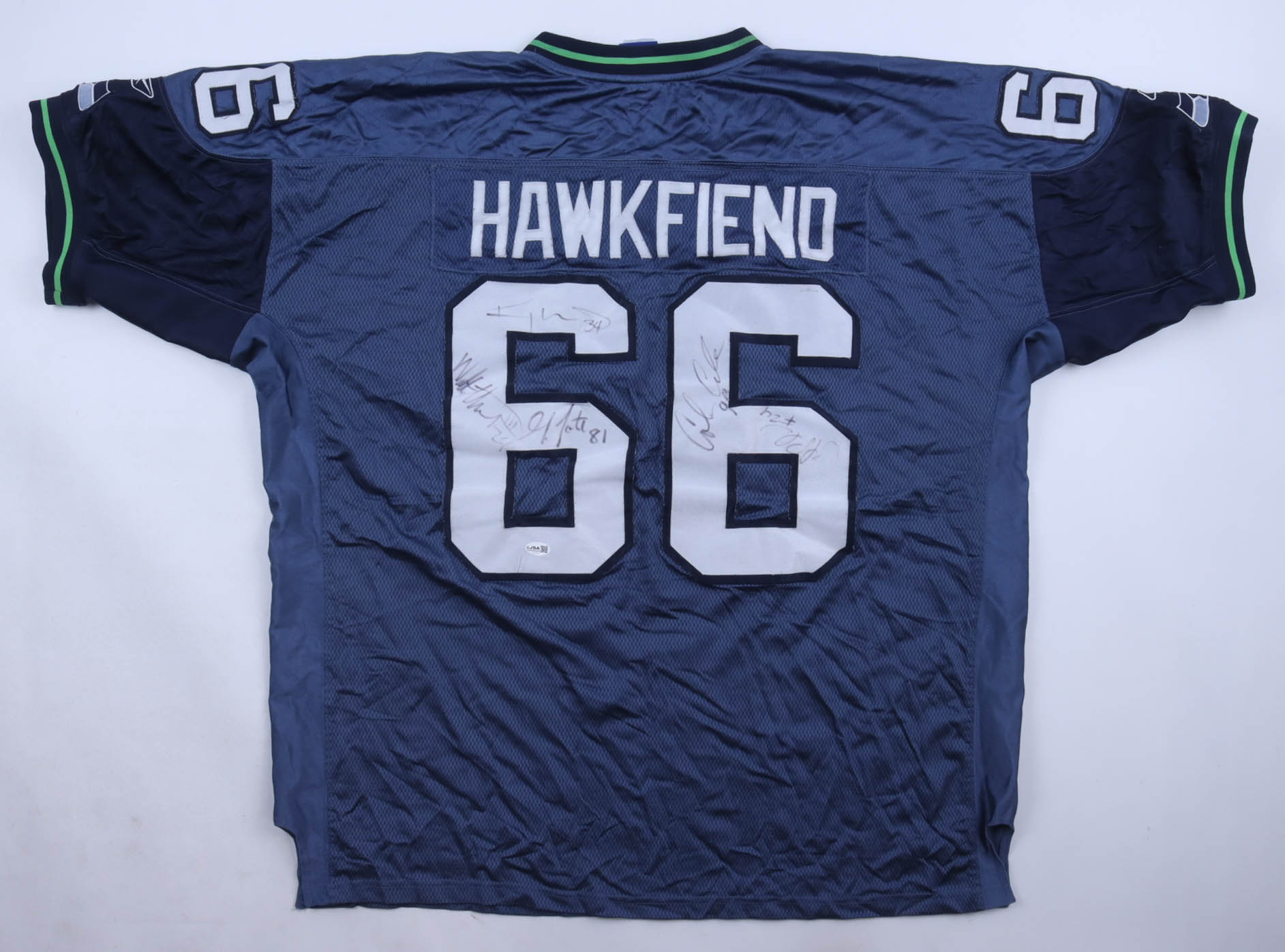 Reebok authentic jersey with everything sewn on, size 58. Hand-signed by Roy Lewis, Golden Tate, Walter Thurmond, Colin Cole, and Shawn Springs. Please note, the jersey is stained and shows signs of age and wear.