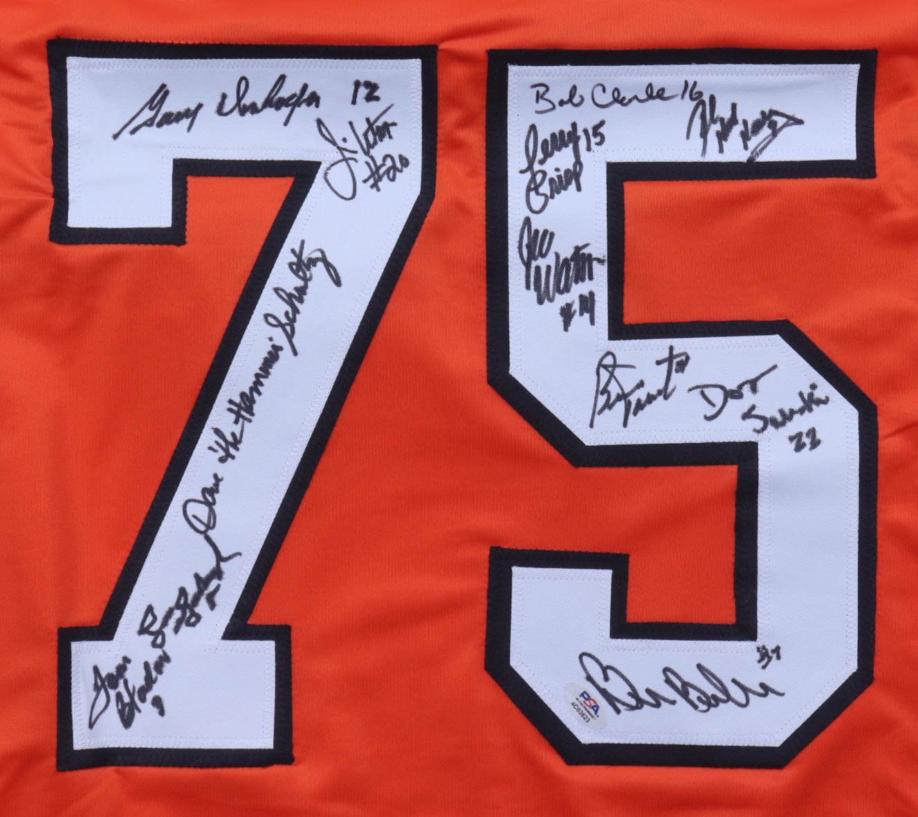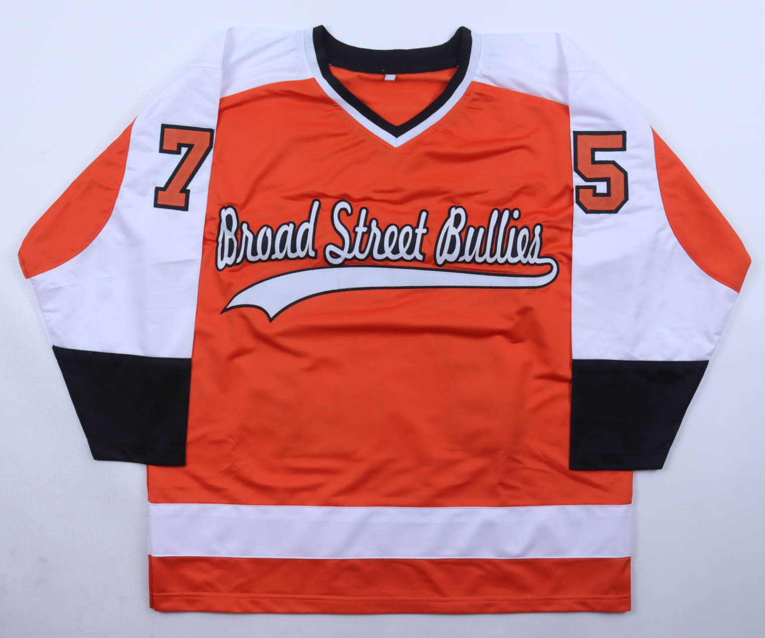 Custom jersey. Everything is sewn on, size XL. Has been hand-signed by Bill Barber, Bernie Parent, Tom Bladon, Gary Dornhoefer, Larry Goodenough, Bob Kelly, Don Saleski, Dave Schultz, Jim Watson, Joe Watson, and 2 others. Please note, some signatures have bled.