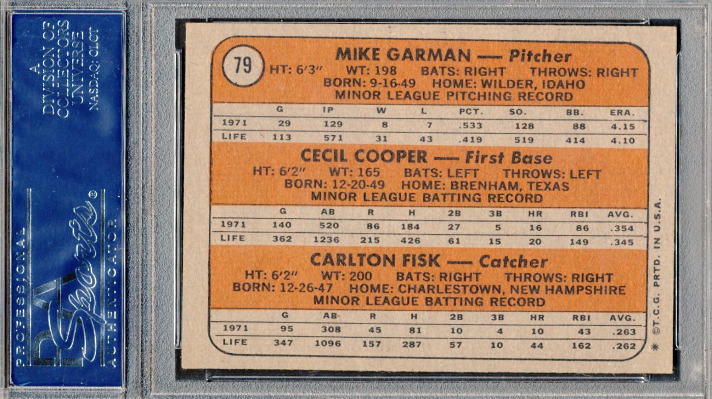 Carlton Fisk Signed Mike Garman / Cecil Cooper RC / Carlton Fisk RC 1972 Topps Rookie Stars #79 (PSA)