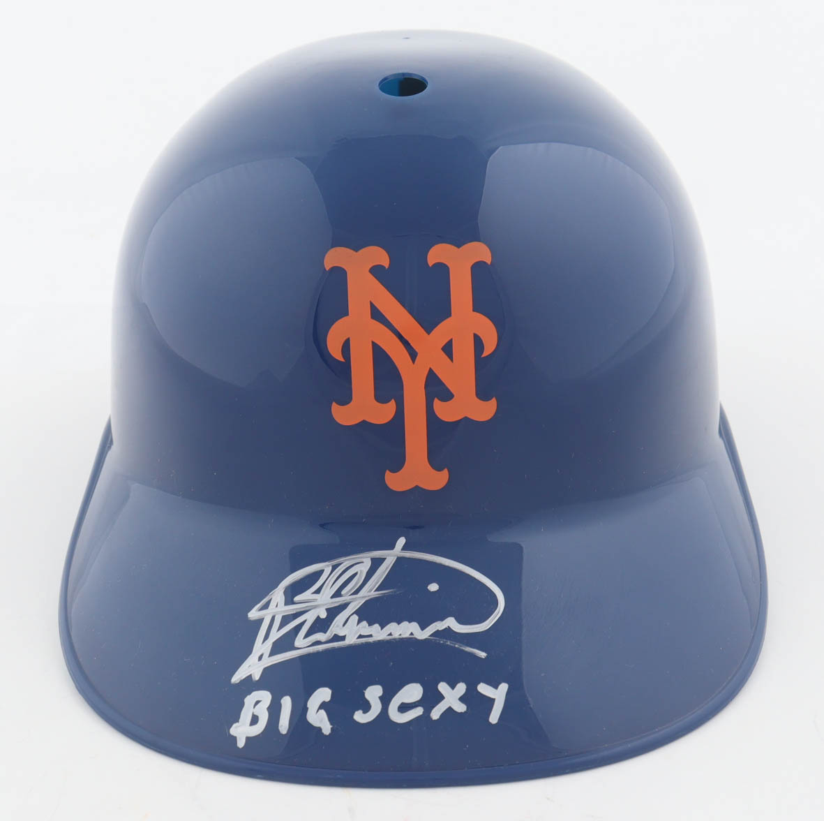 New York Mets Full-Size Plastic Souvenir Replica Batting Helmet. Hand signed and inscribed by Bartolo Colon. Please note, there is scuffing throughout the helmet.