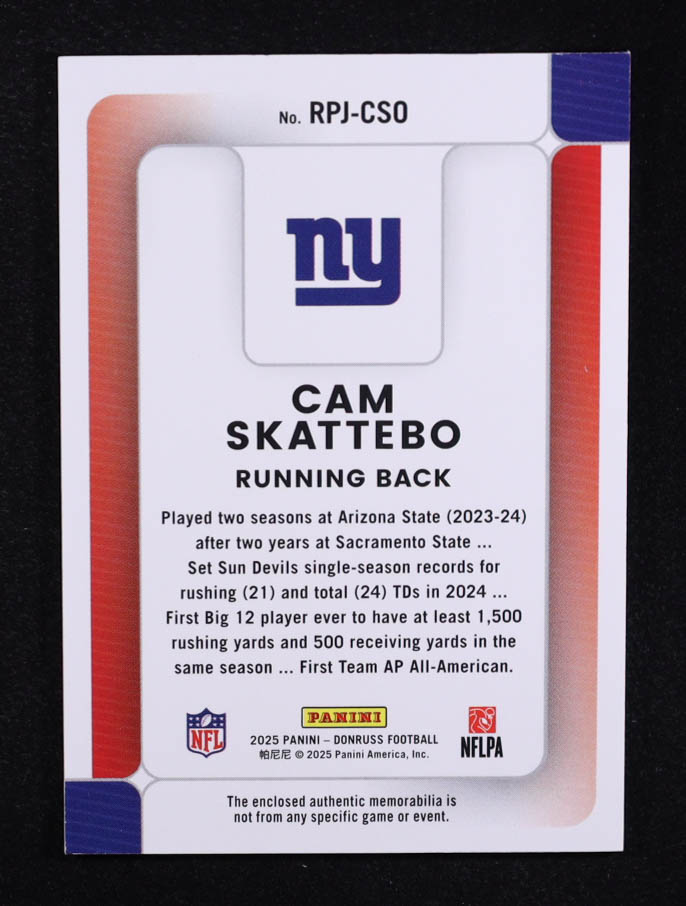 Cam Skattebo 2025 Panini Donruss Rookie Phenom Jerseys #RPJ-CSO RC