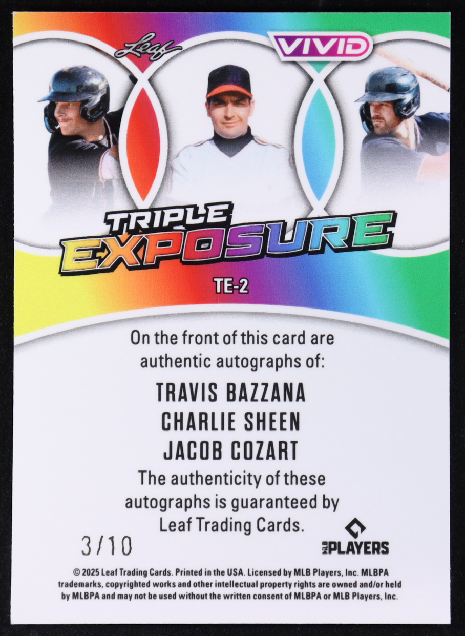 Travis Bazzana / Charlie Sheen / Jacob Cozart 2025 Leaf Vivid Baseball Triple Exposure Teal Laser Triple Autograph #TE-2 #3/10