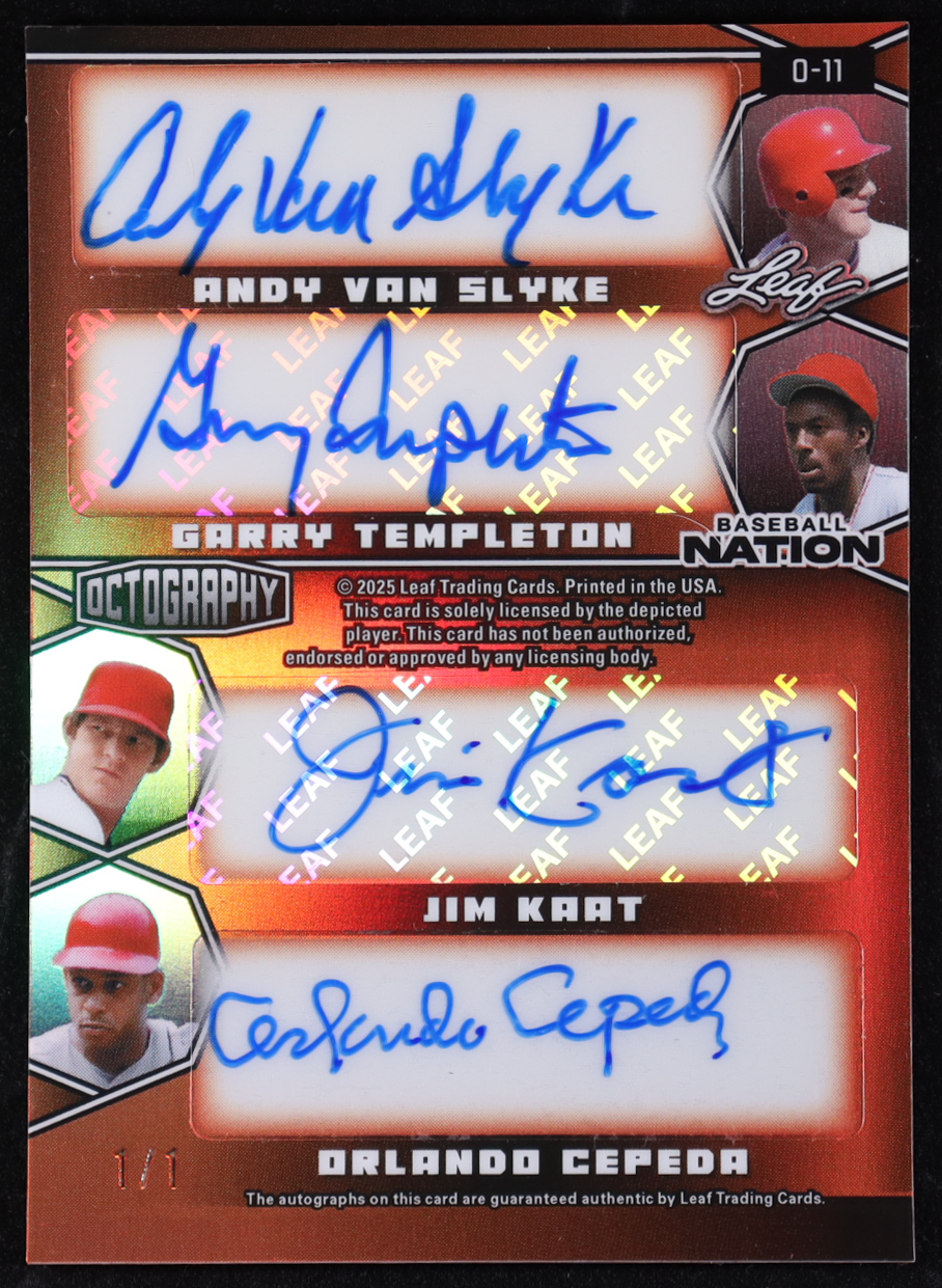 2025 Leaf Baseball Nation Octography Autograph Red Prismatic #O-11 #1/1 Ozzie Smith / Vince Coleman / Jack Clark / Scott Rolen / Andy Van Slyke / Garry Templeton / Jim Kaat / Orlando Cepeda