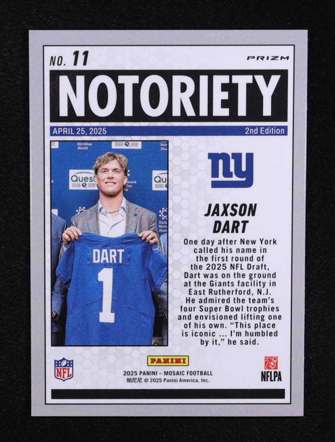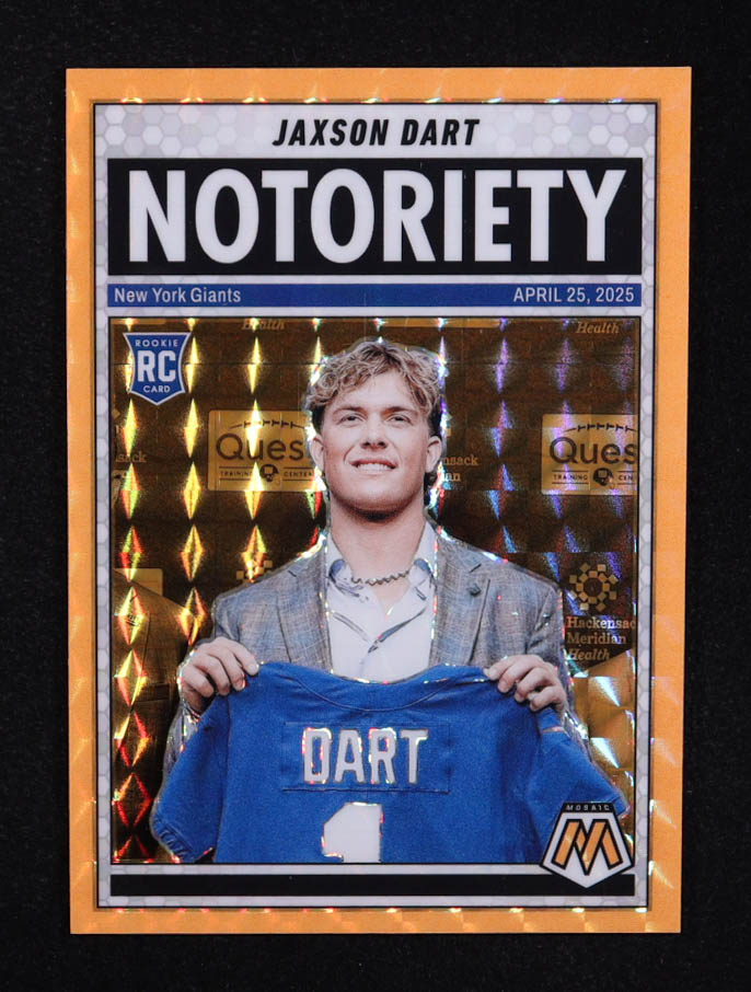 Jaxson Dart 2025 Panini Mosaic Notoriety Orange Fluorescent #11 RC