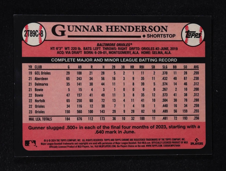 Gunnar Henderson 2024 Topps Chrome Silver Pack Series 2 Blue Refractors 1989 35th Anniversary #2T89C-B #008/150