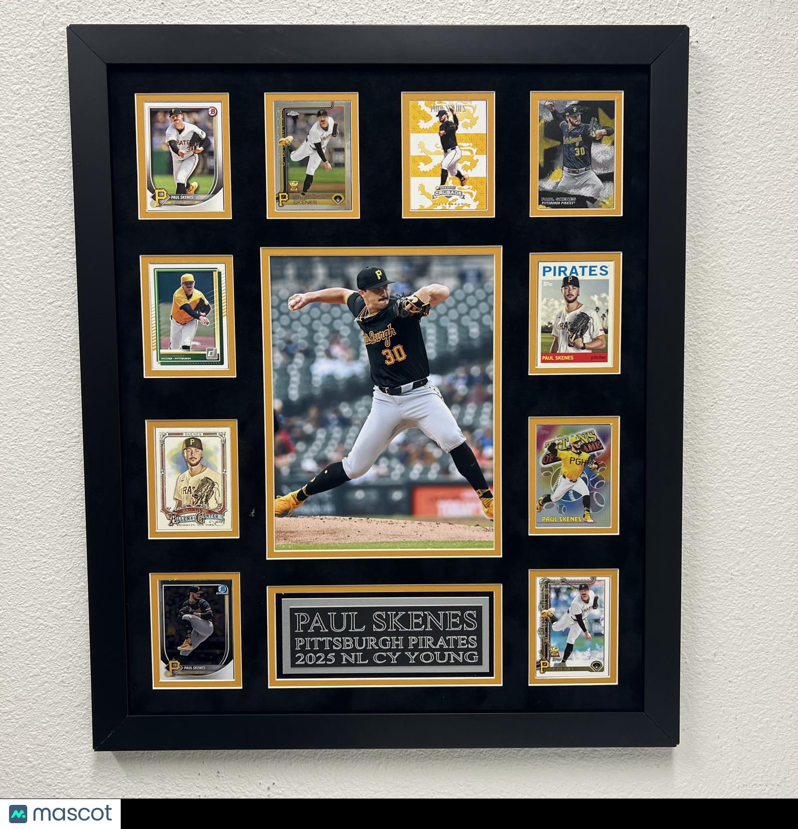 Custom frame measures 18" x 22" in size and features an unsigned photo of Paul Skenes (Pittsburgh Pirates). Also featured in the frame are (10) different trading cards of Paul Skenes.