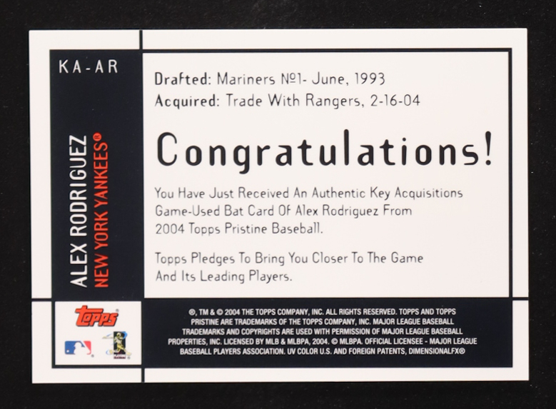 Alex Rodriguez 2004 Topps Pristine Key Acquisition Bat Relics #KA-AR