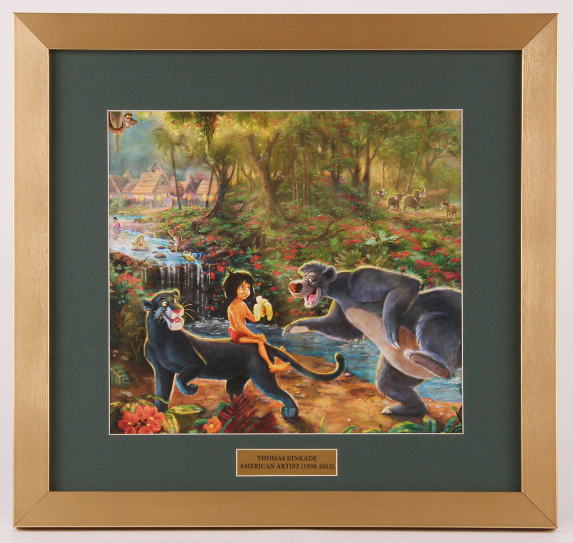 Custom framed display measures approximately 17" x 18" in size and features a print of "The Jungle Book" from Thomas Kinkade (D. 2012).