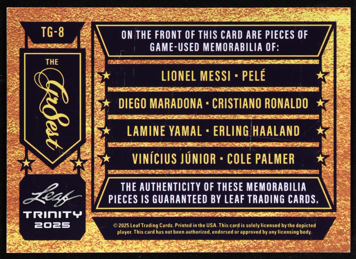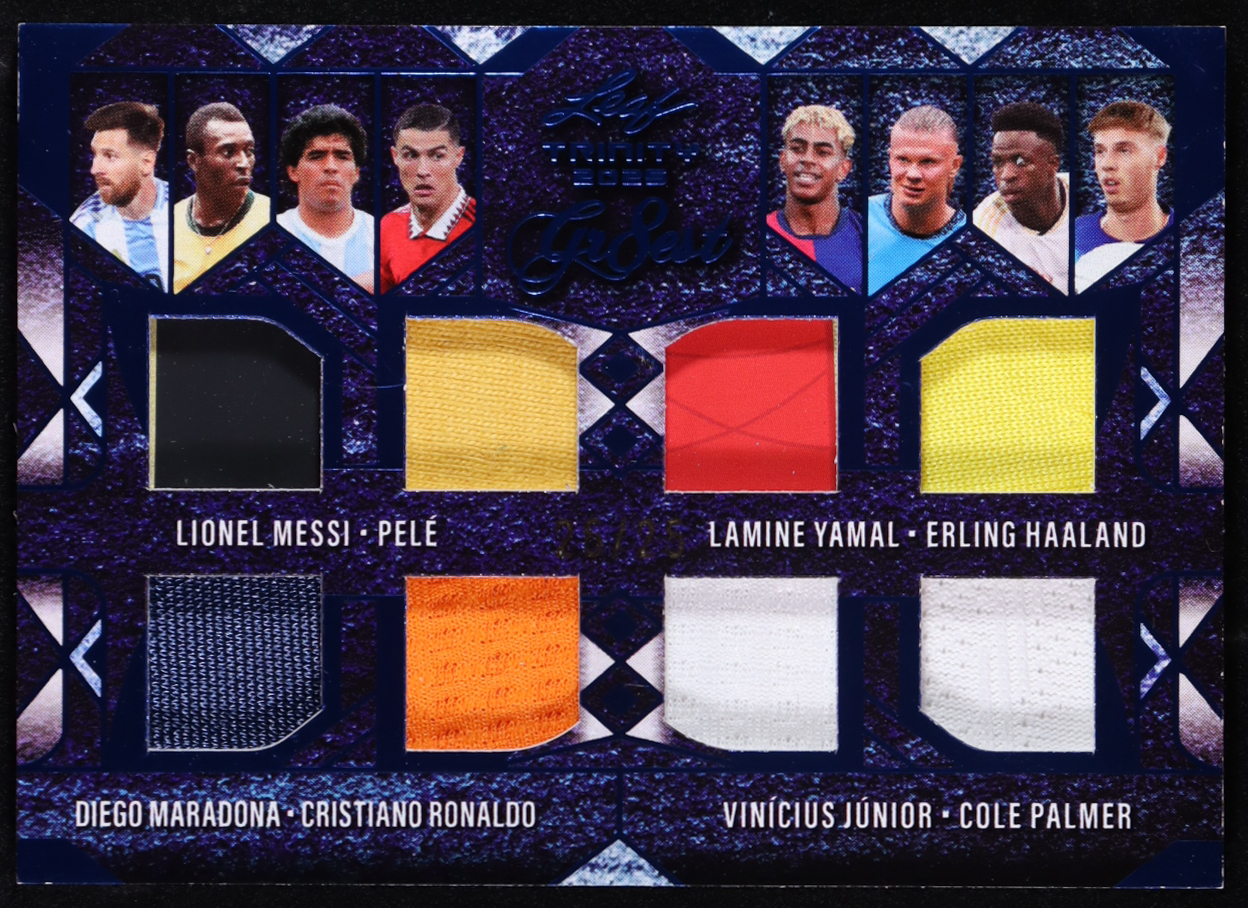 2025 Leaf Trinity The Gr8est Blue 8-Way Game-Used Memorabilia #TG-8 #25/25 Lionel Messi / Pelé / Diego Maradona / Cristiano Ronaldo / Lamine Yamal / Erling Haaland / Vinícius Júnior / Cole Palmer