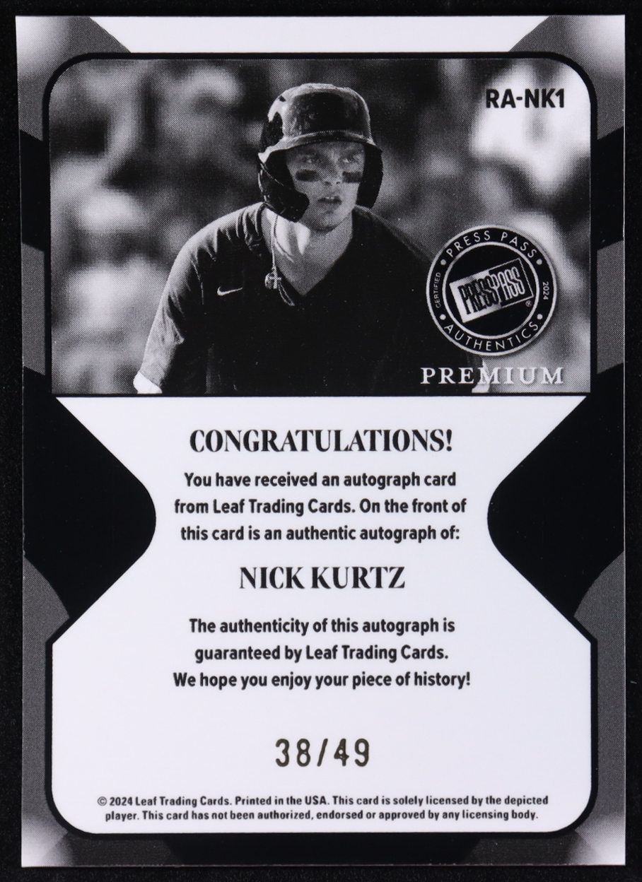 Nick Kurtz 2024 Leaf Press Pass Premium Silver Autograph #RA-NK1 #38/49