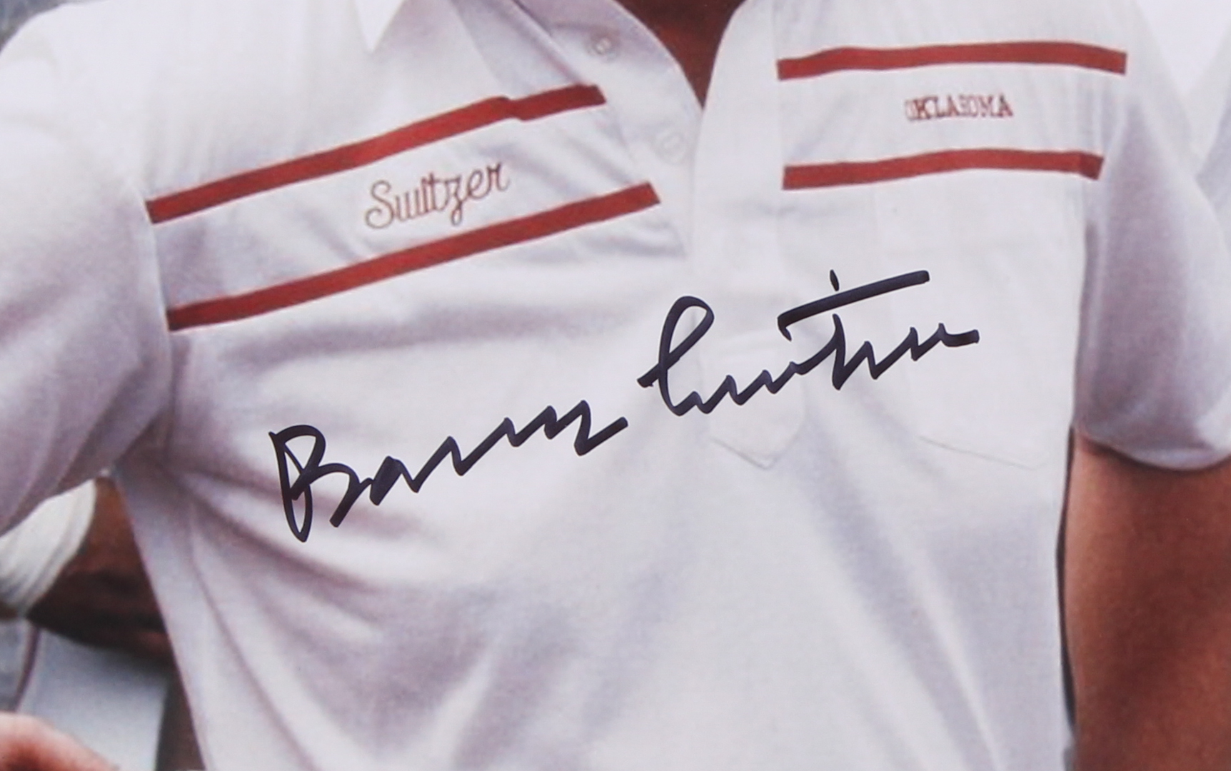 Photo measures 16" x 20" in size and has been hand-signed in black felt-tip pen by Barry Switzer.