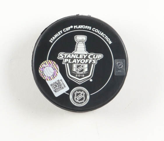 Chicago Blackhawks 2015 Stanley Cup Champions logo hockey puck has been hand-signed by Jonathan Toews.