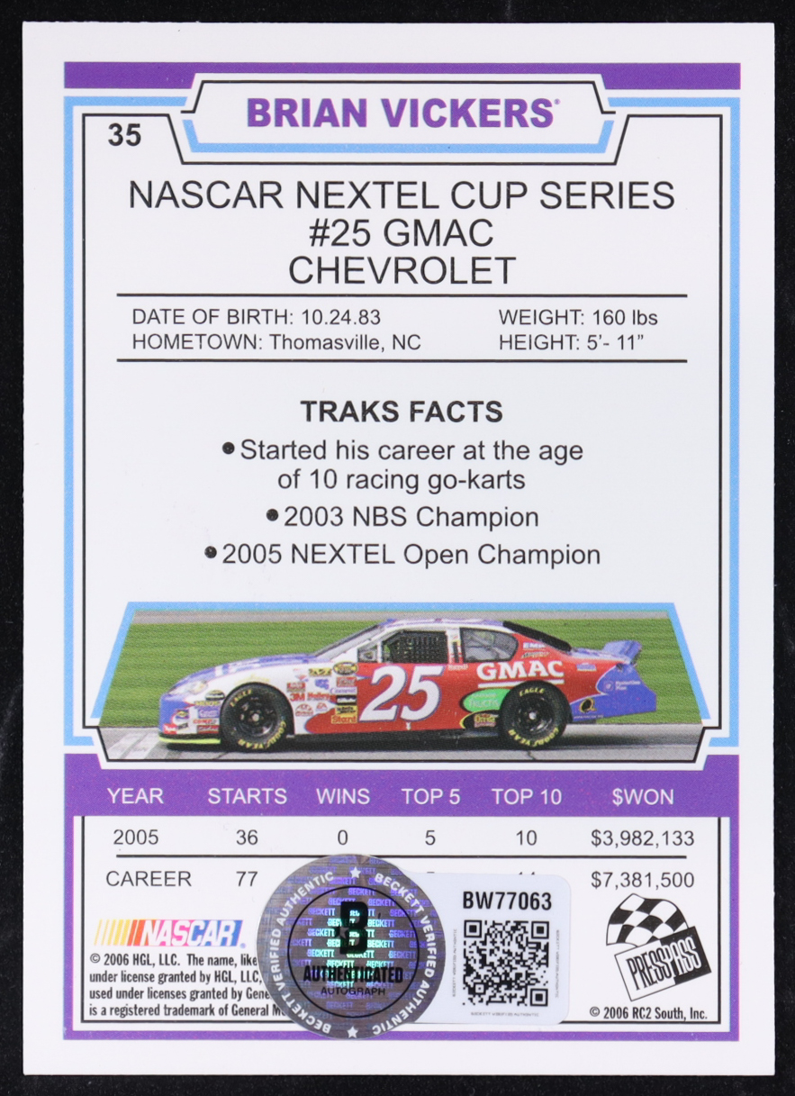 Brian Vickers Signed 2006 TRAKS #35 (Beckett)