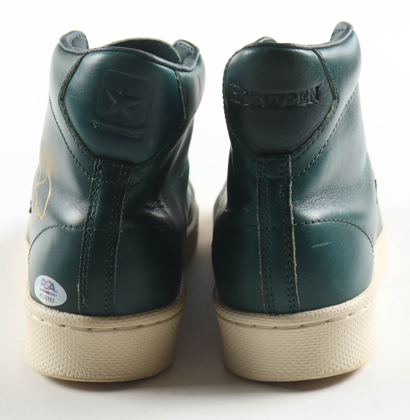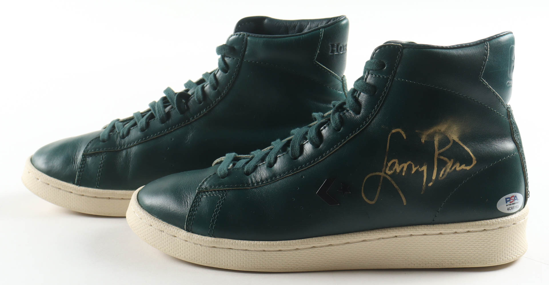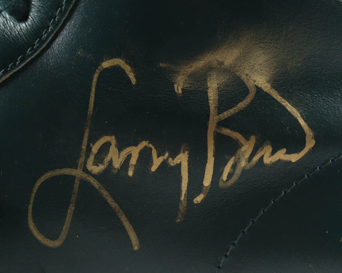 Pair of (2) Horween Leather Co. x Converse Pro Leather High Basketball Shoes. Hand-signed by Larry Bird (Boston Celtics, HOF). Display case is included as shown. Please note, signature has been smudged.