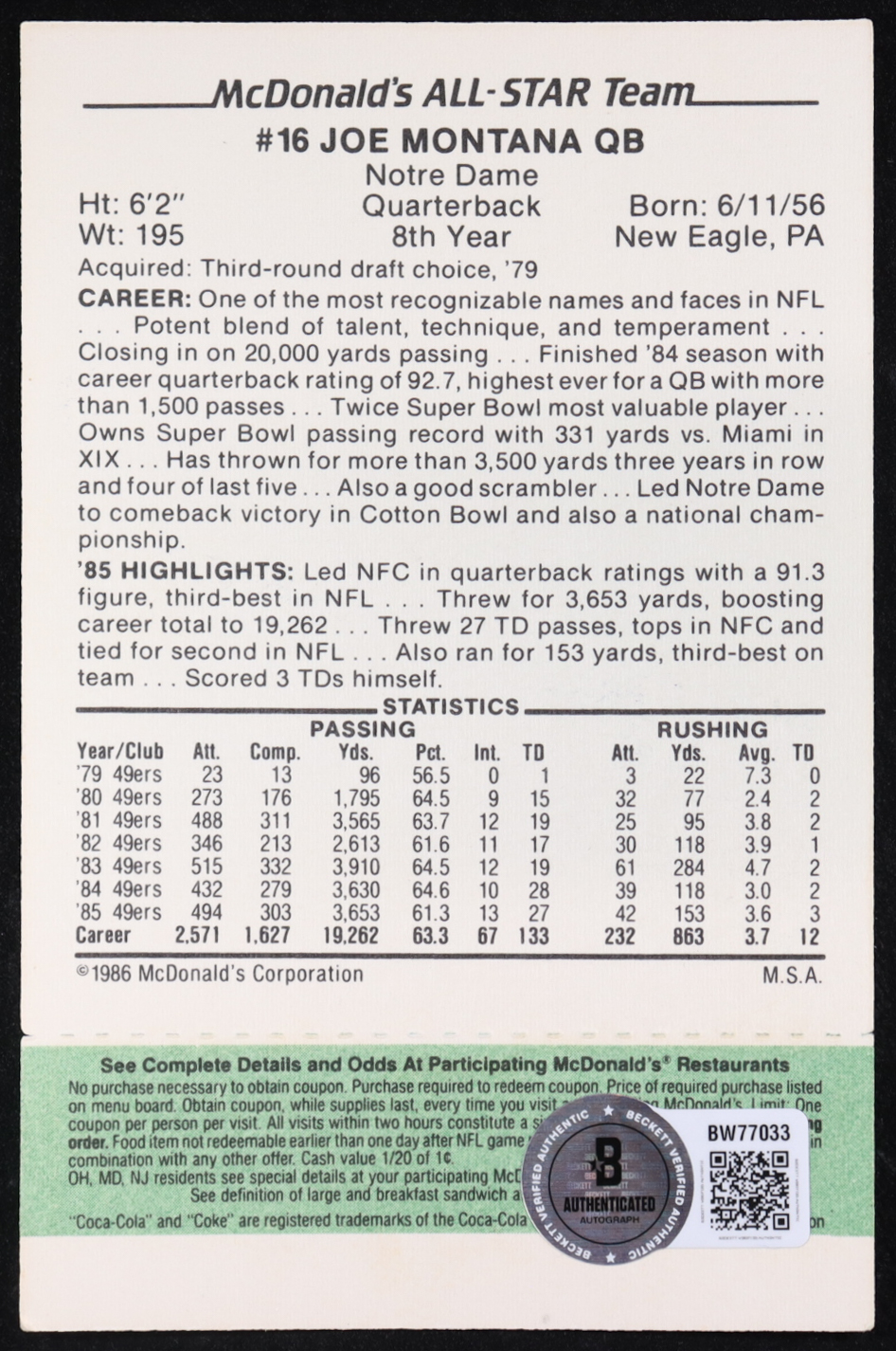 Joe Montana Signed 1986 McDonald's All-Stars Green Tab #16 (Beckett)