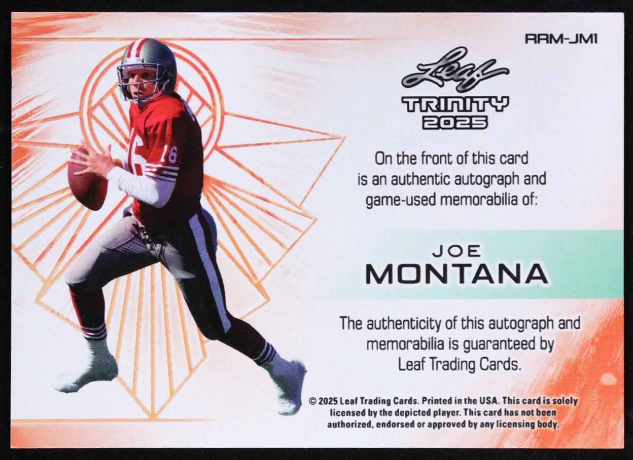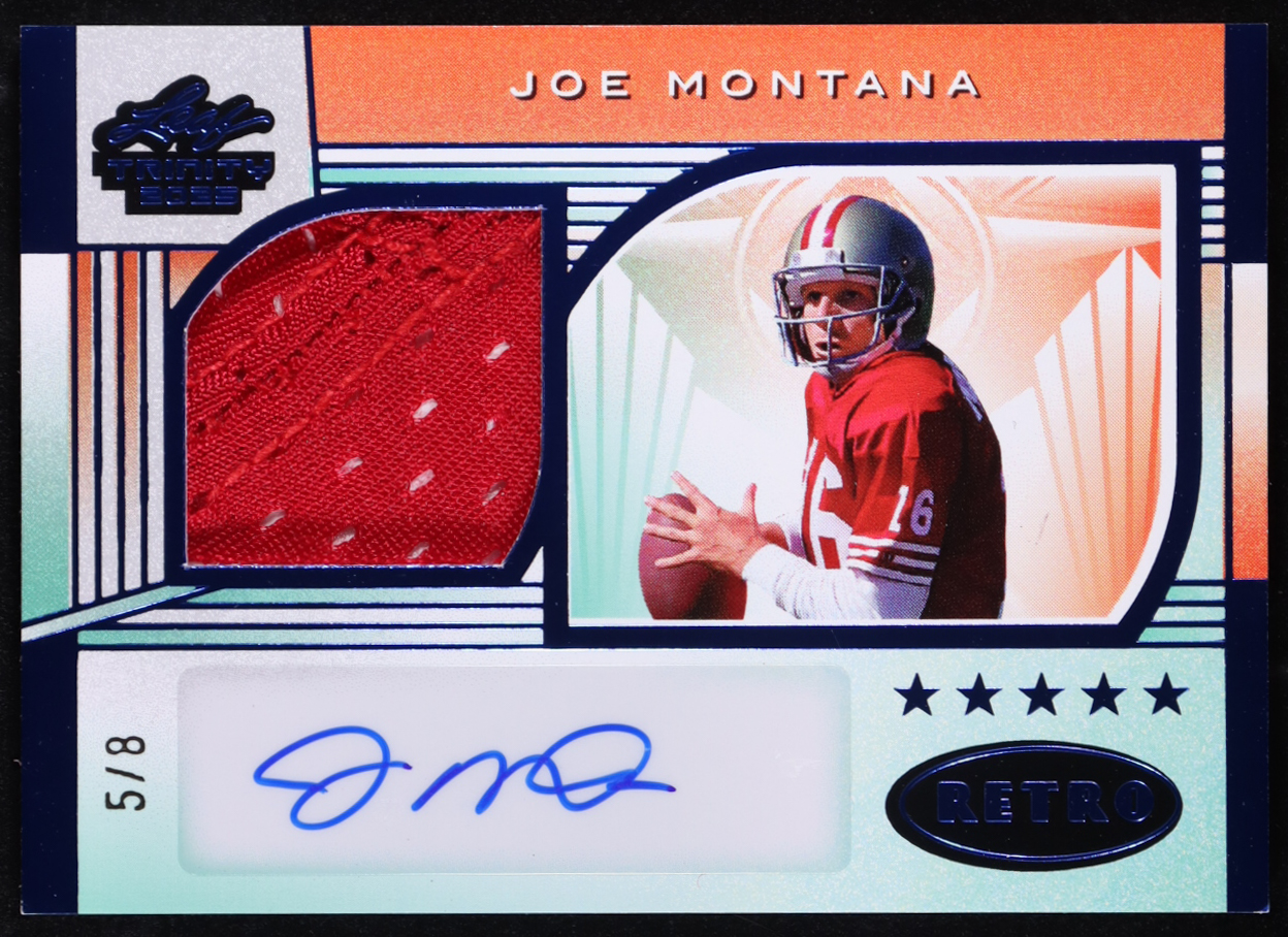 Joe Montana 2025 Leaf Trinity Retro Rookie Autographs Memorabilia Blue Game-Used #RRM-JM1 #5/8
