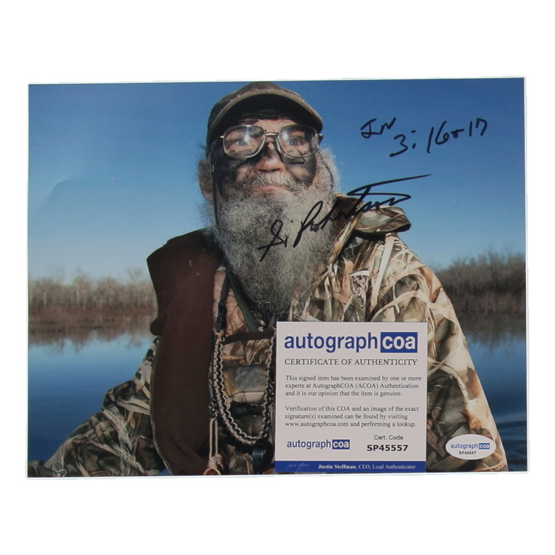 Photo measures 8" x 10" in size and has been hand-signed and inscribed by Si Robertson.